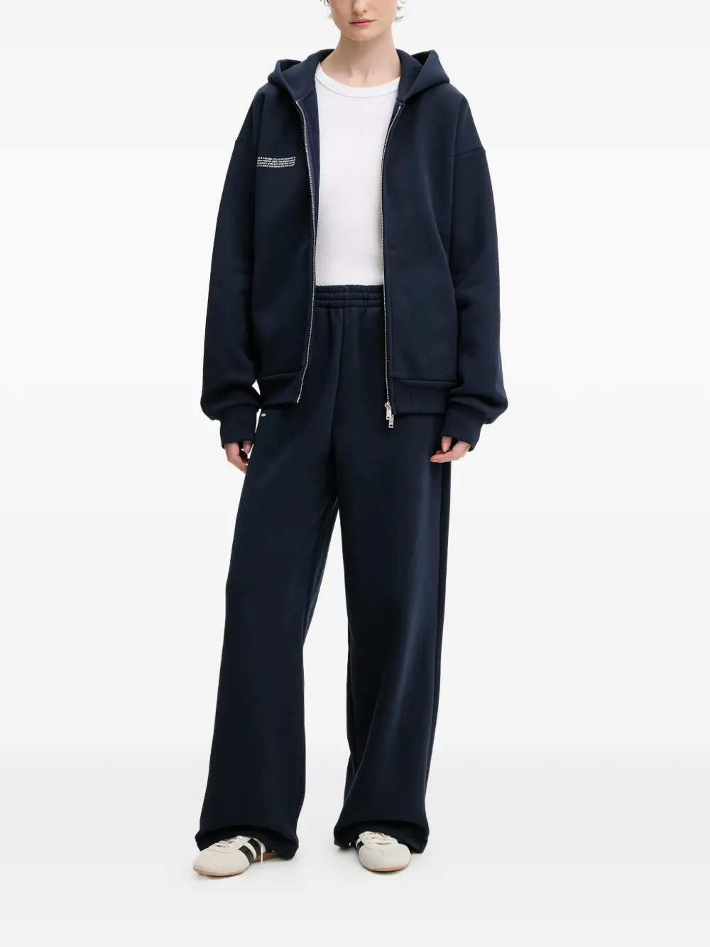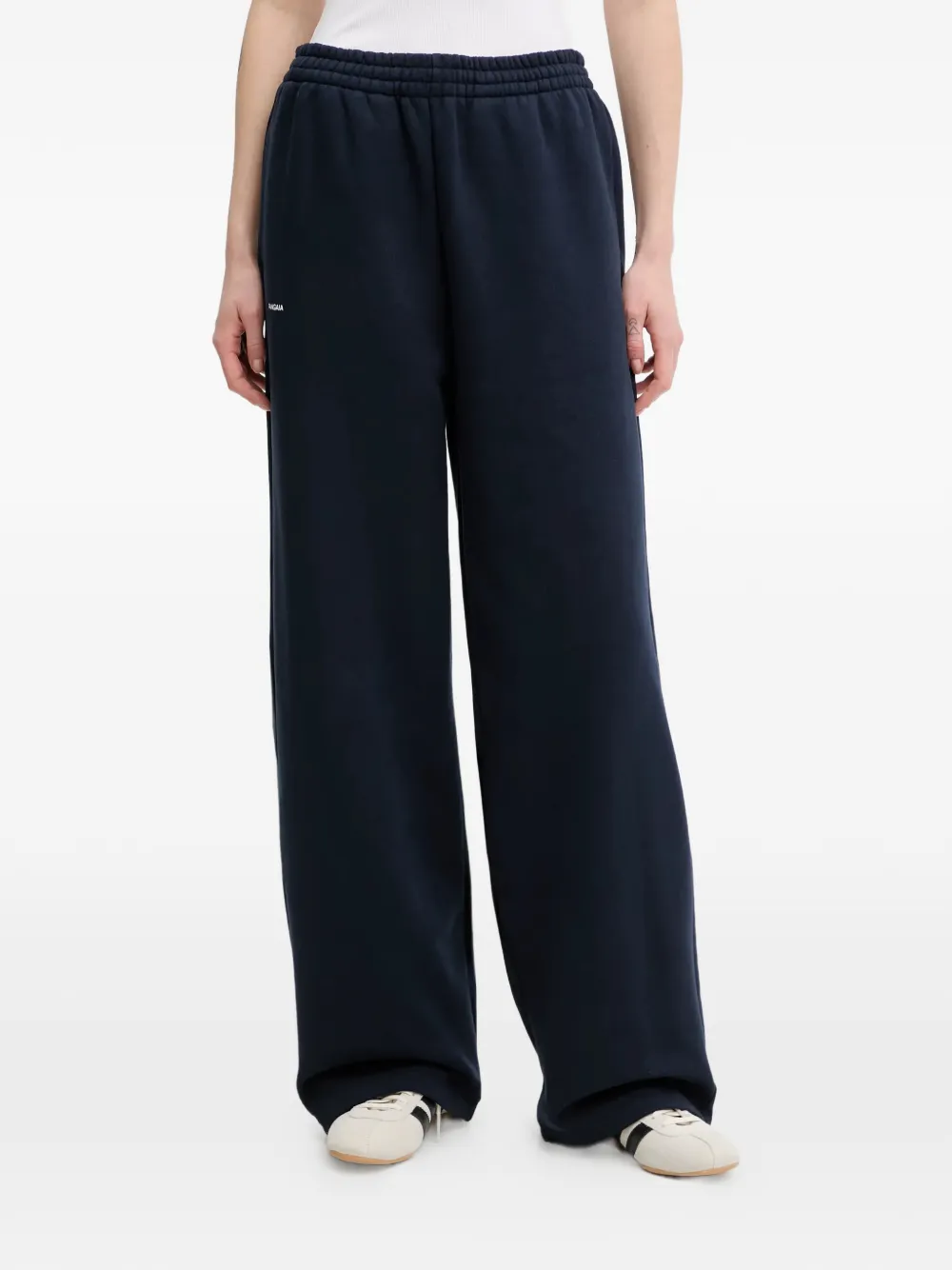 Темно-синие широкие брюки с эластичным поясом и тональной надписью-логотипом
