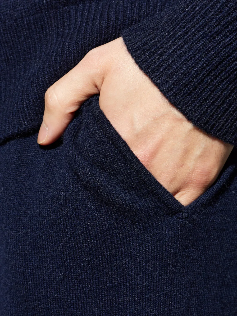 Темно-синий цвет, ребристый край, боковые карманы, ребристый пояс