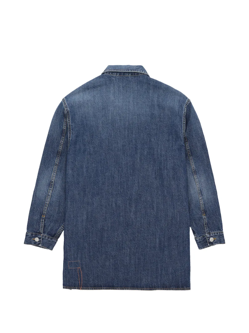 Синий цвет, застежка на пуговицы спереди, накладные карманы, длинные рукава, манжеты на пуговицах, контрастная строчка
