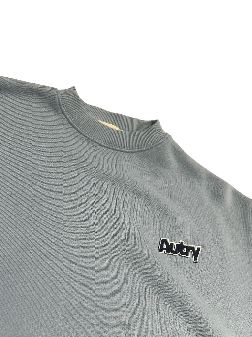 Синий свитер с логотипом, круглым вырезом, длинными рукавами, ребристой отделкой по низу и манжетам