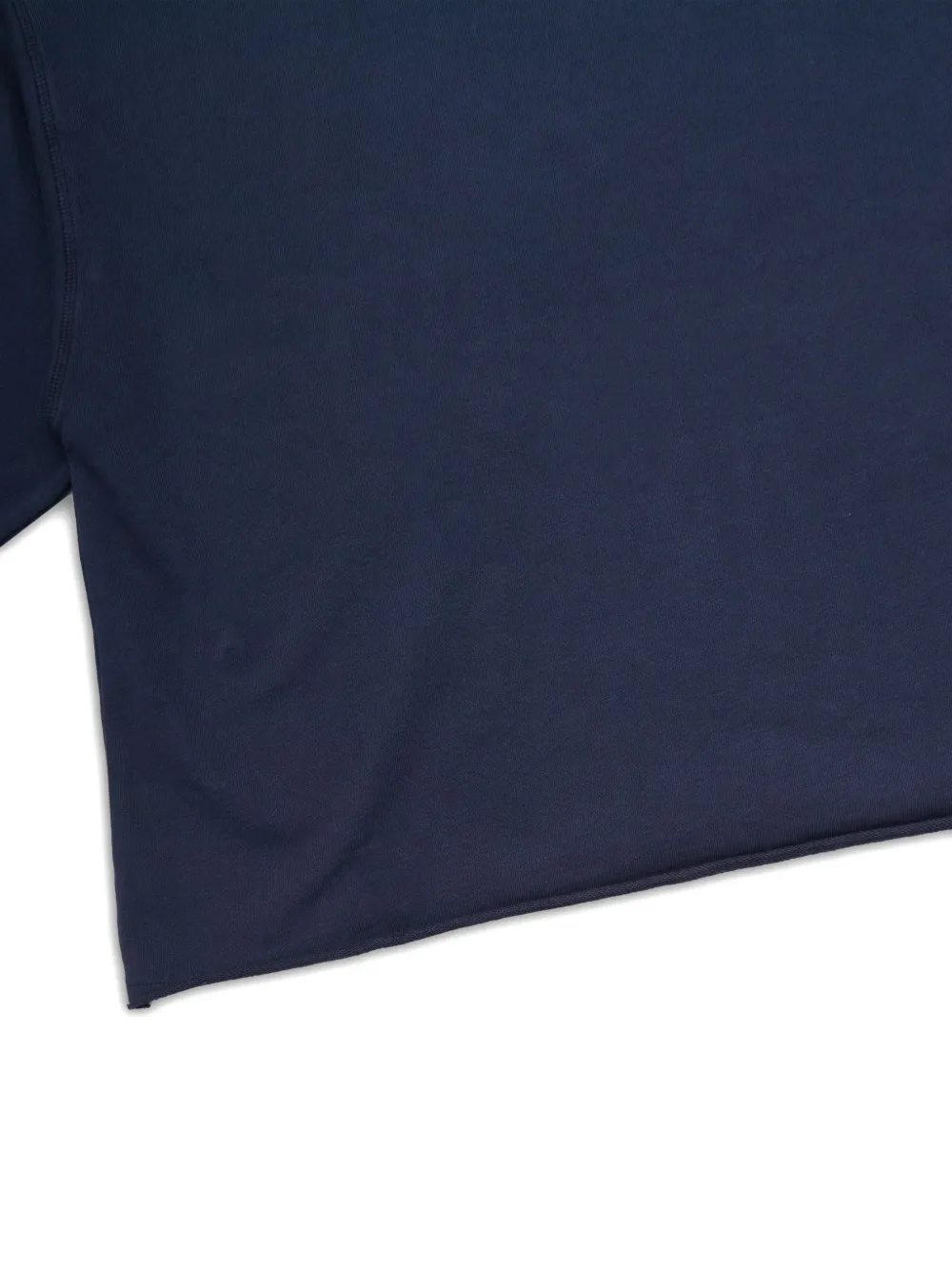 Темно-синий свитер с круглым вырезом, петлевой вязкой, манжетами в рубчик и необработанным краем