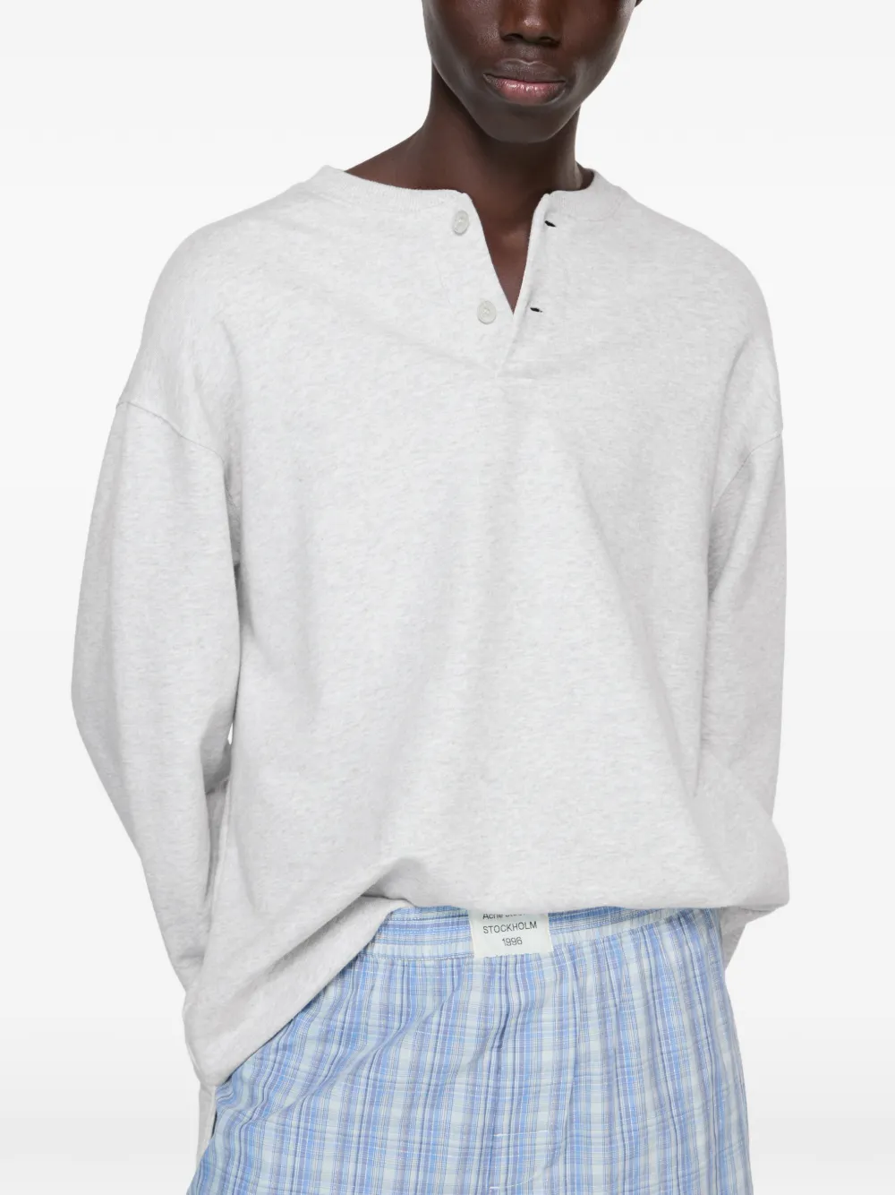 Серый лонгслив с вышитым логотипом, горловиной-хенли и застежкой на пуговицы