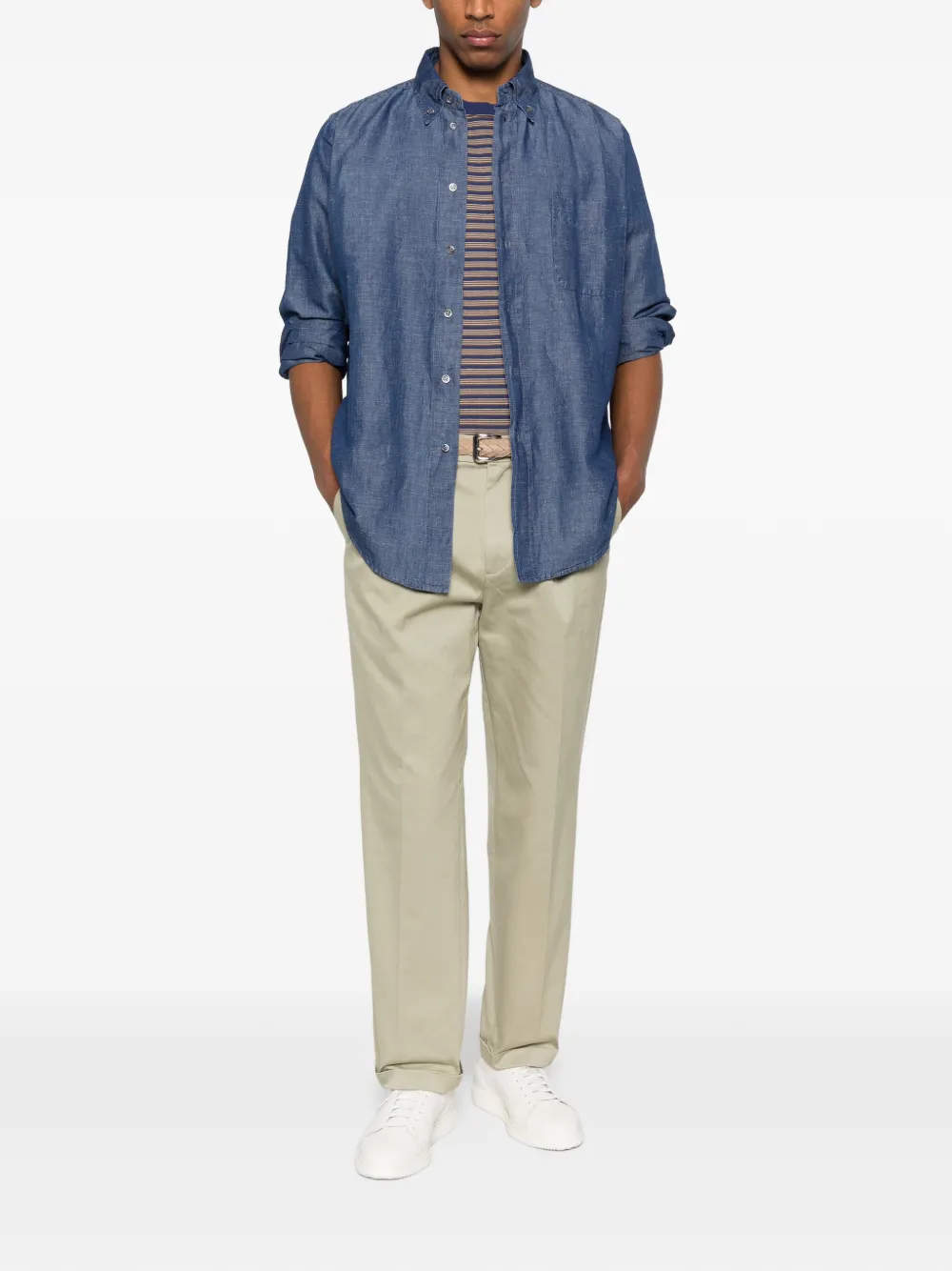 Зеленый цвет, застежка на пуговицы спереди, шлевки для ремня, боковые прорезные карманы, отделка складками, подогнутый край