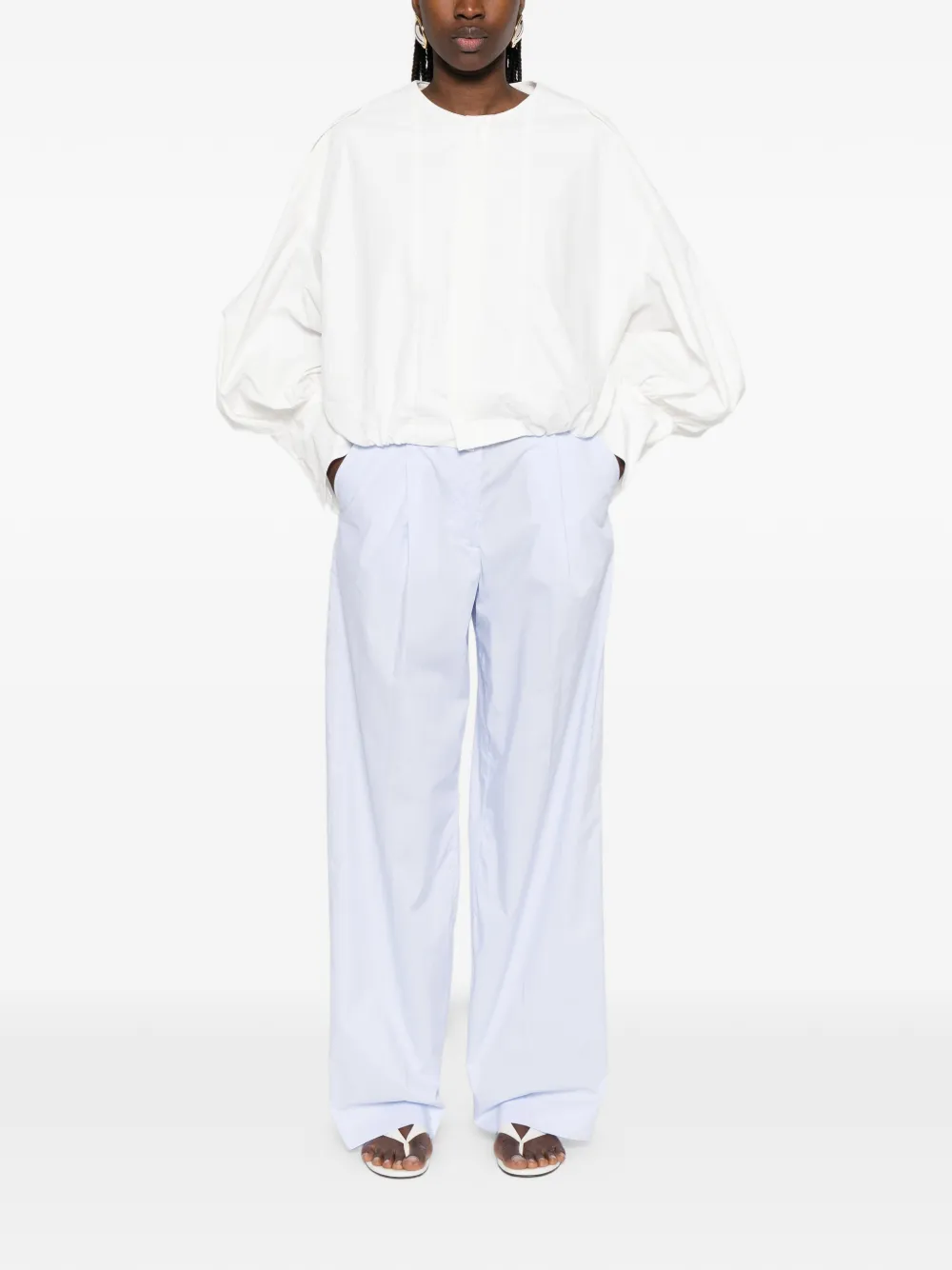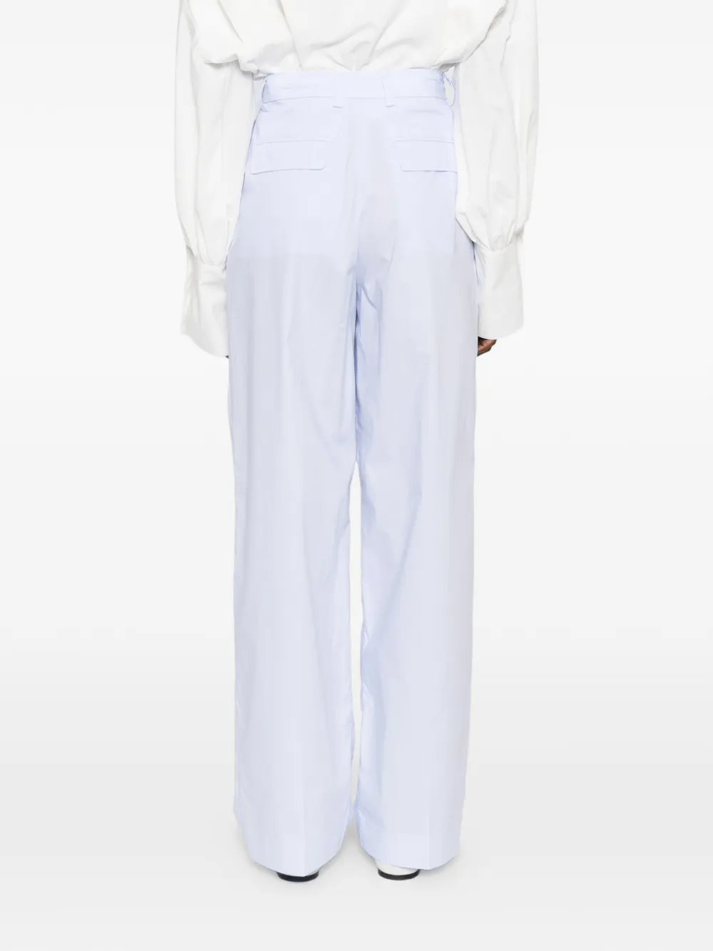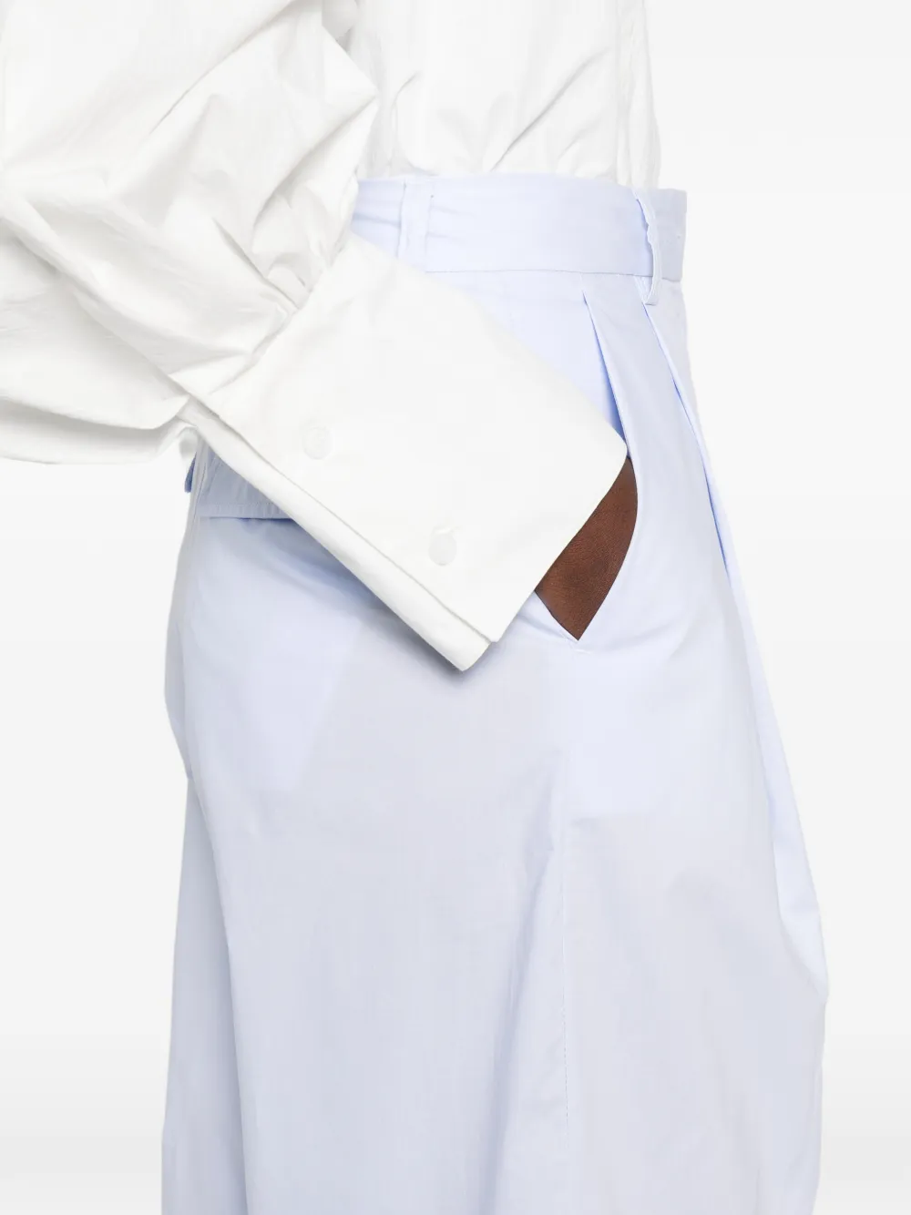Светло-голубые складки, застежка на пуговицы спереди, шлевки для пояса