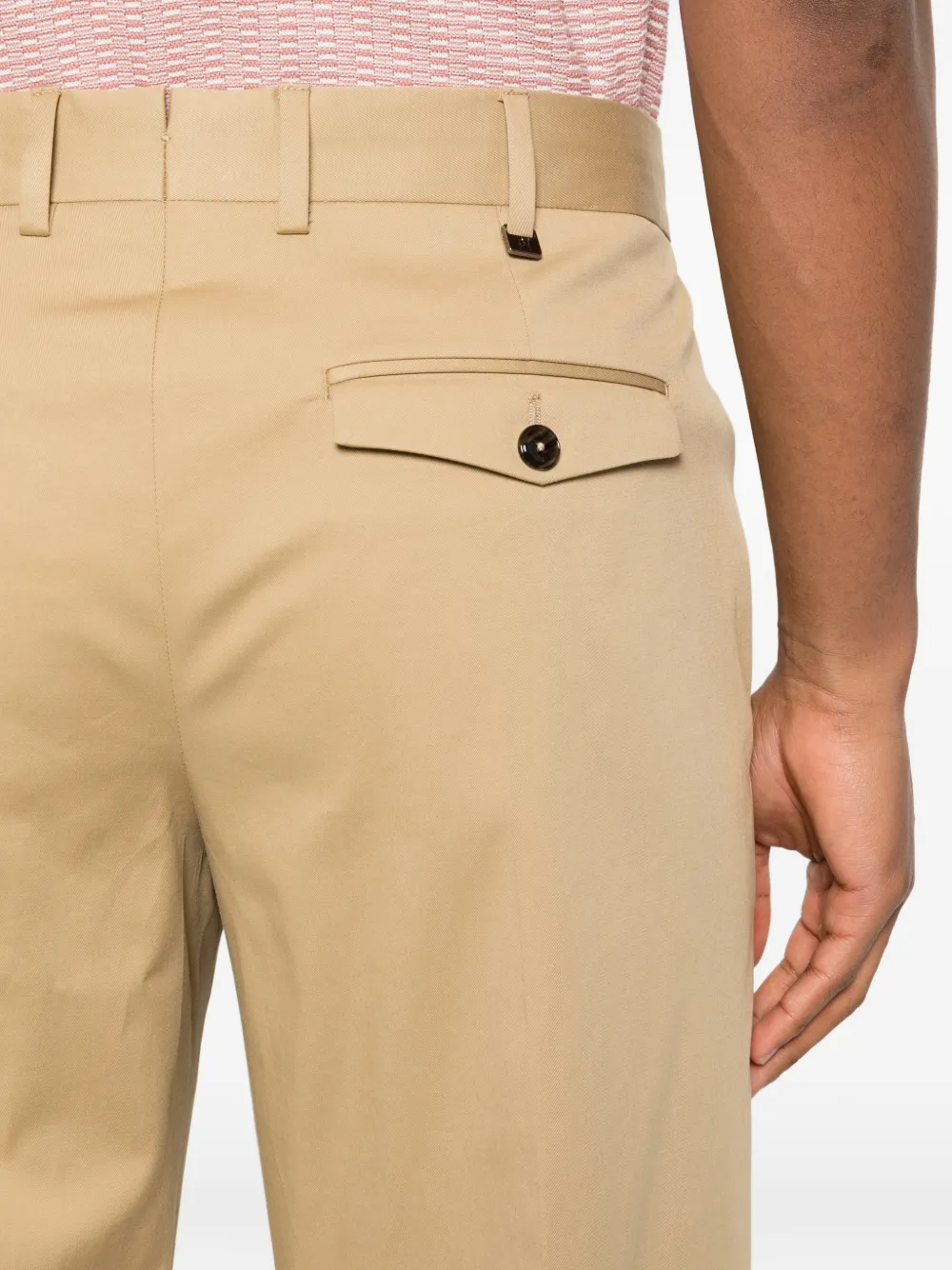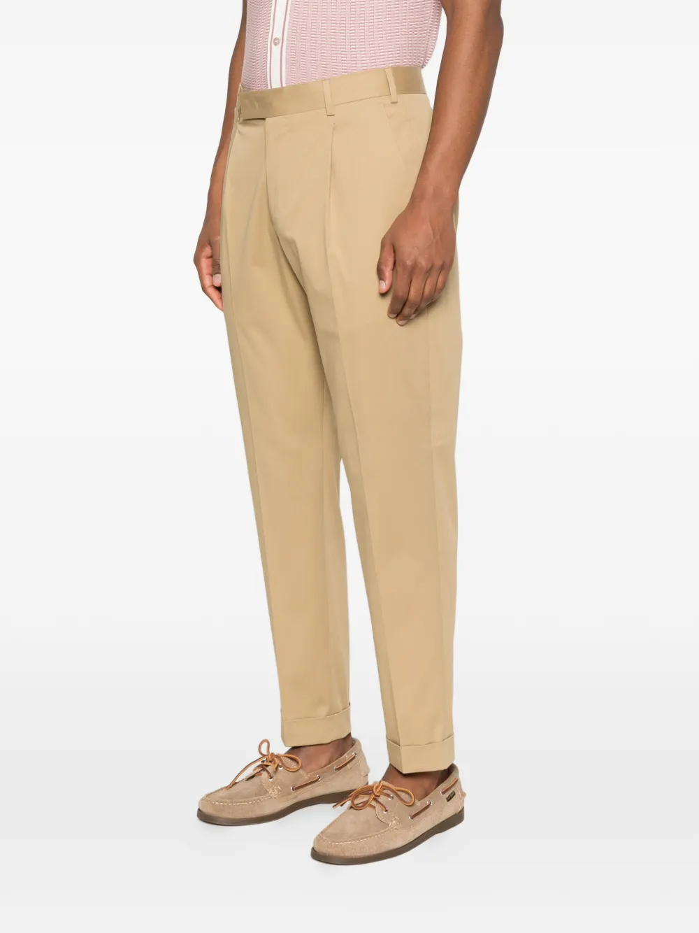 Бежевые брюки с отворотами, складками, боковыми косыми карманами и шлевками для ремня