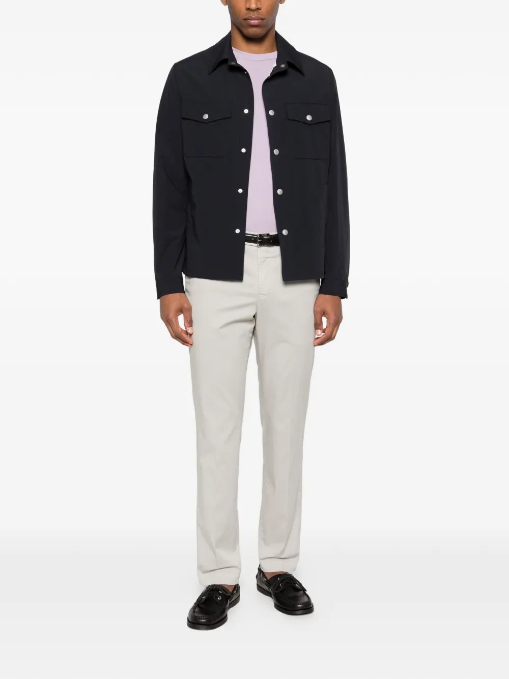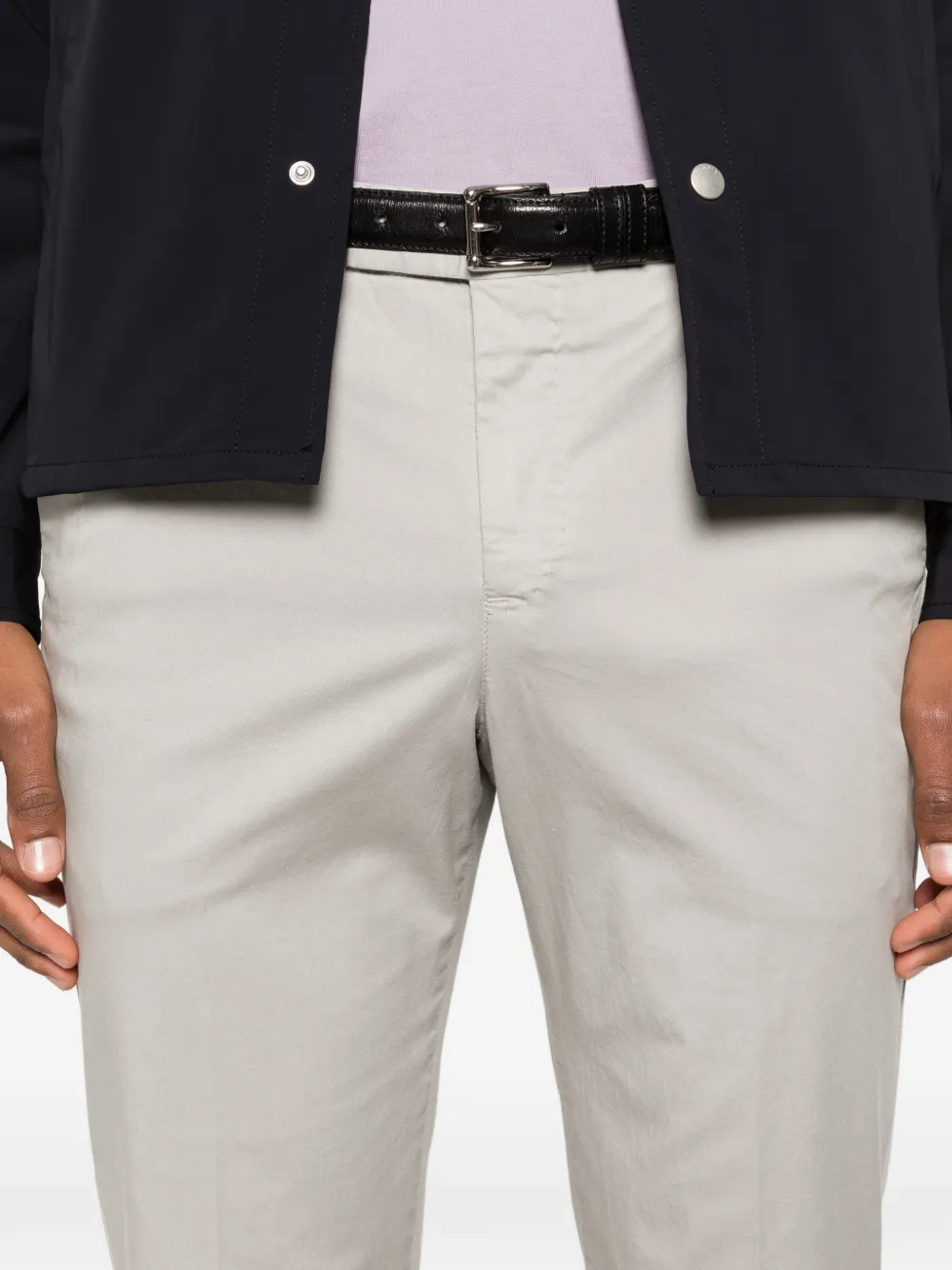 Серые шлевки для ремня, боковые карманы, задние прорезные карманы, скрытая застежка спереди