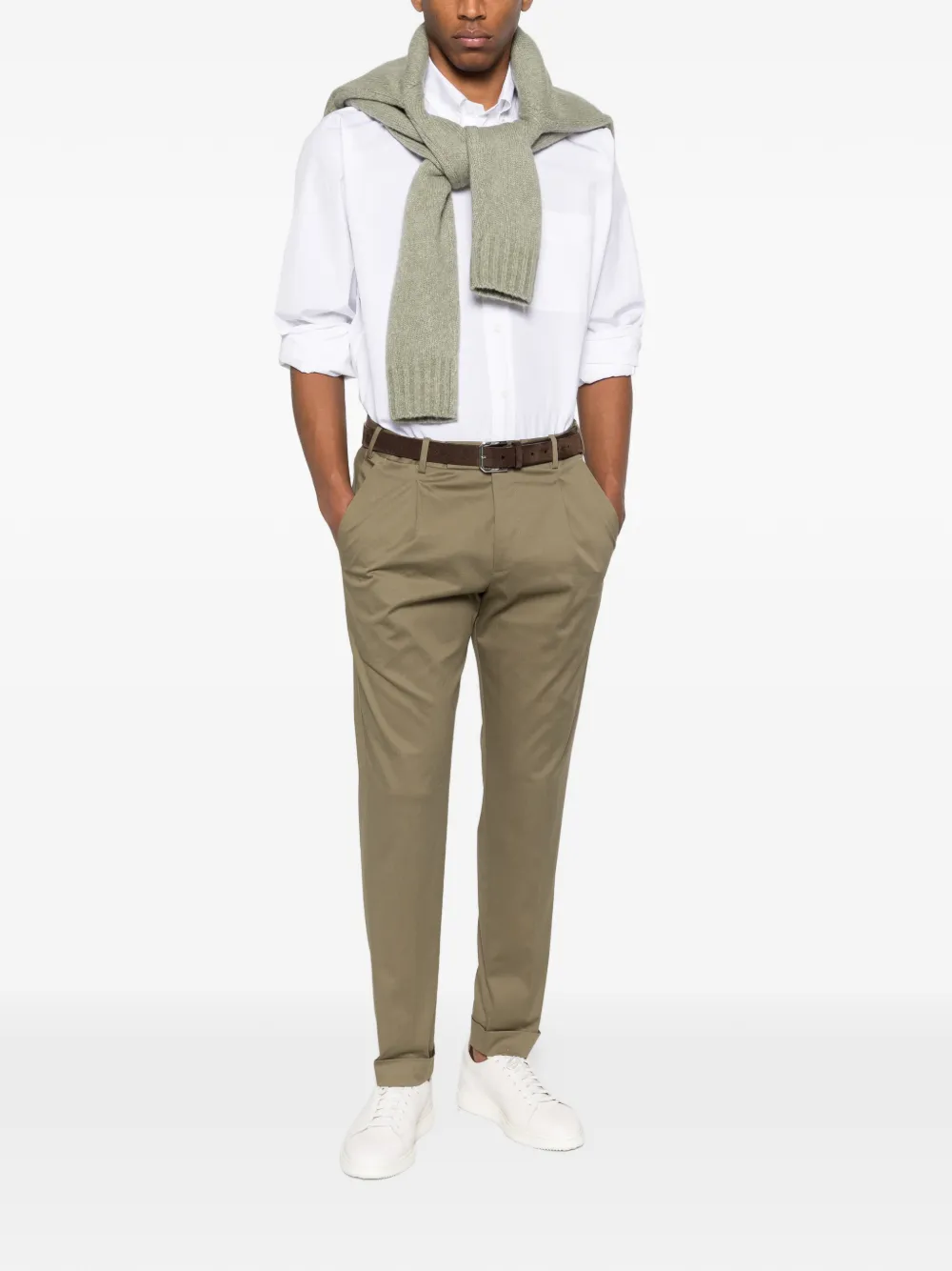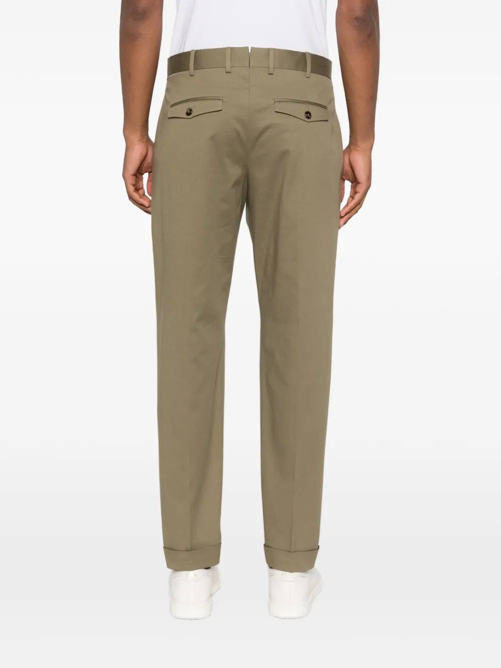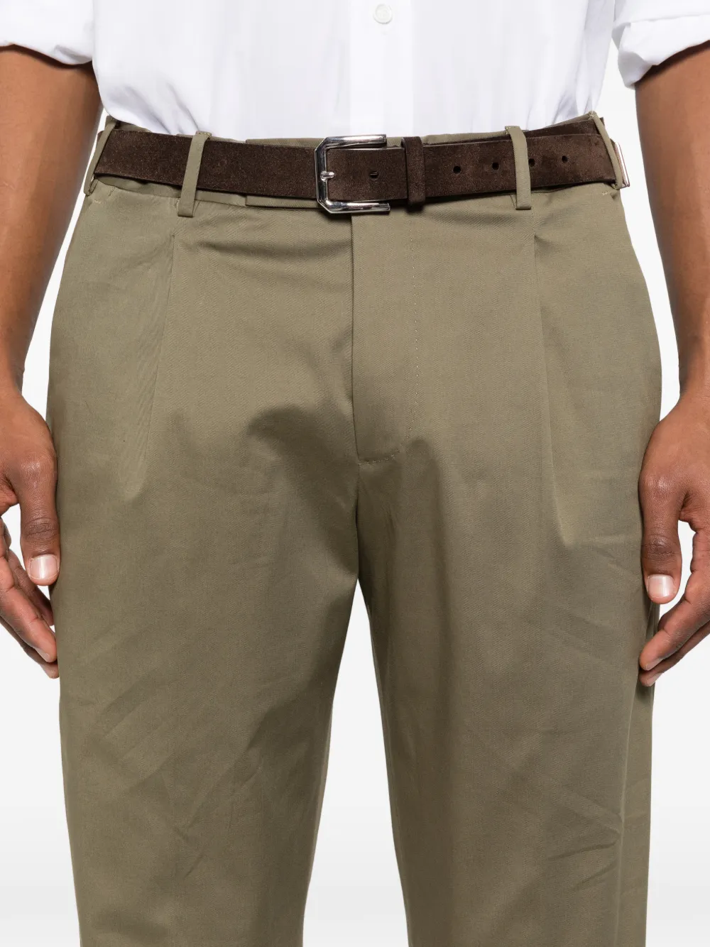 Зеленые брюки с подворотами, шлевками для ремня, складками, боковыми косыми карманами и задними карманами с клапанами