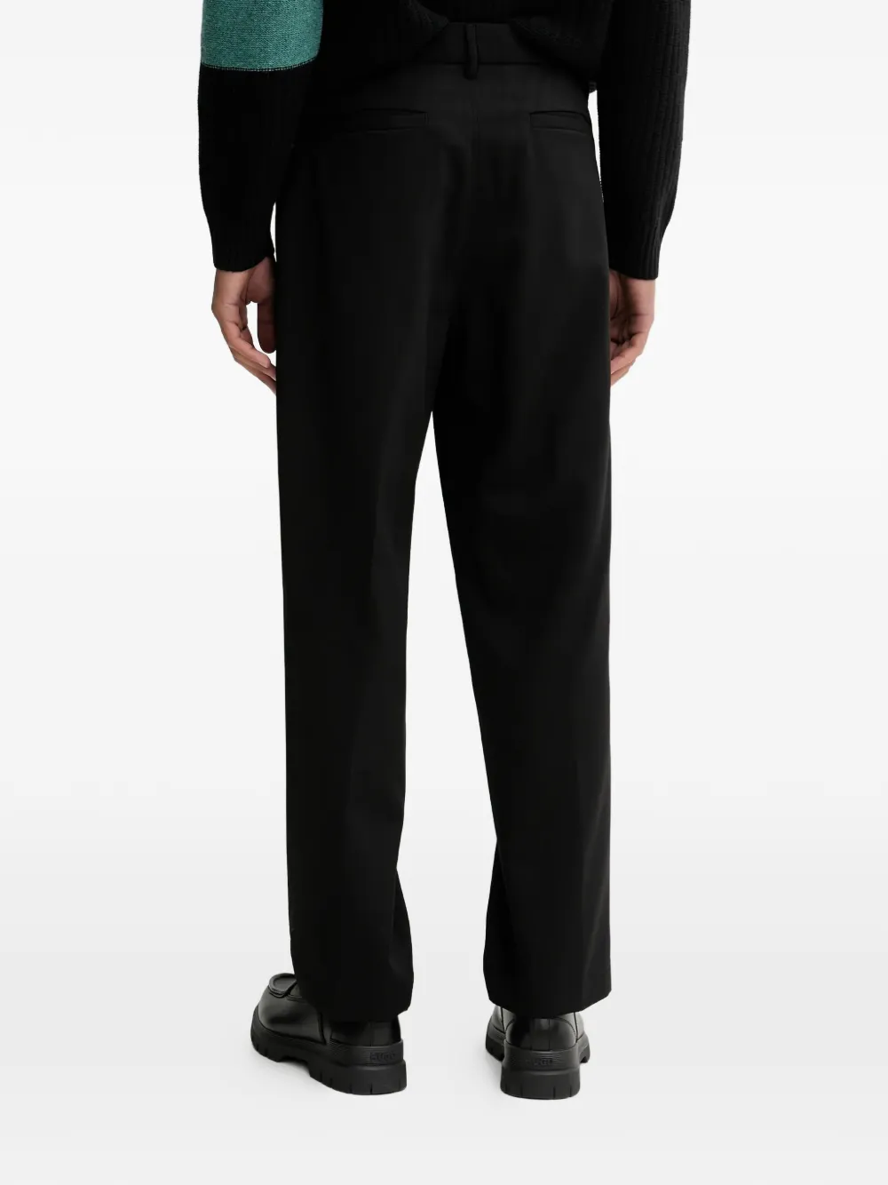 Черные с защипами спереди, боковыми карманами, задним карманом, шлевками для ремня