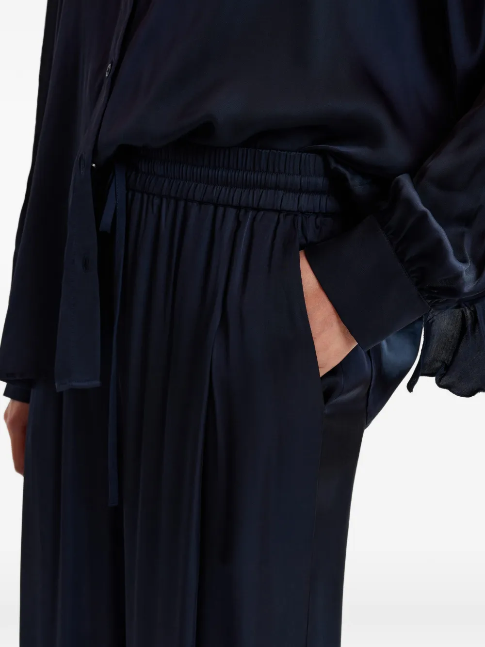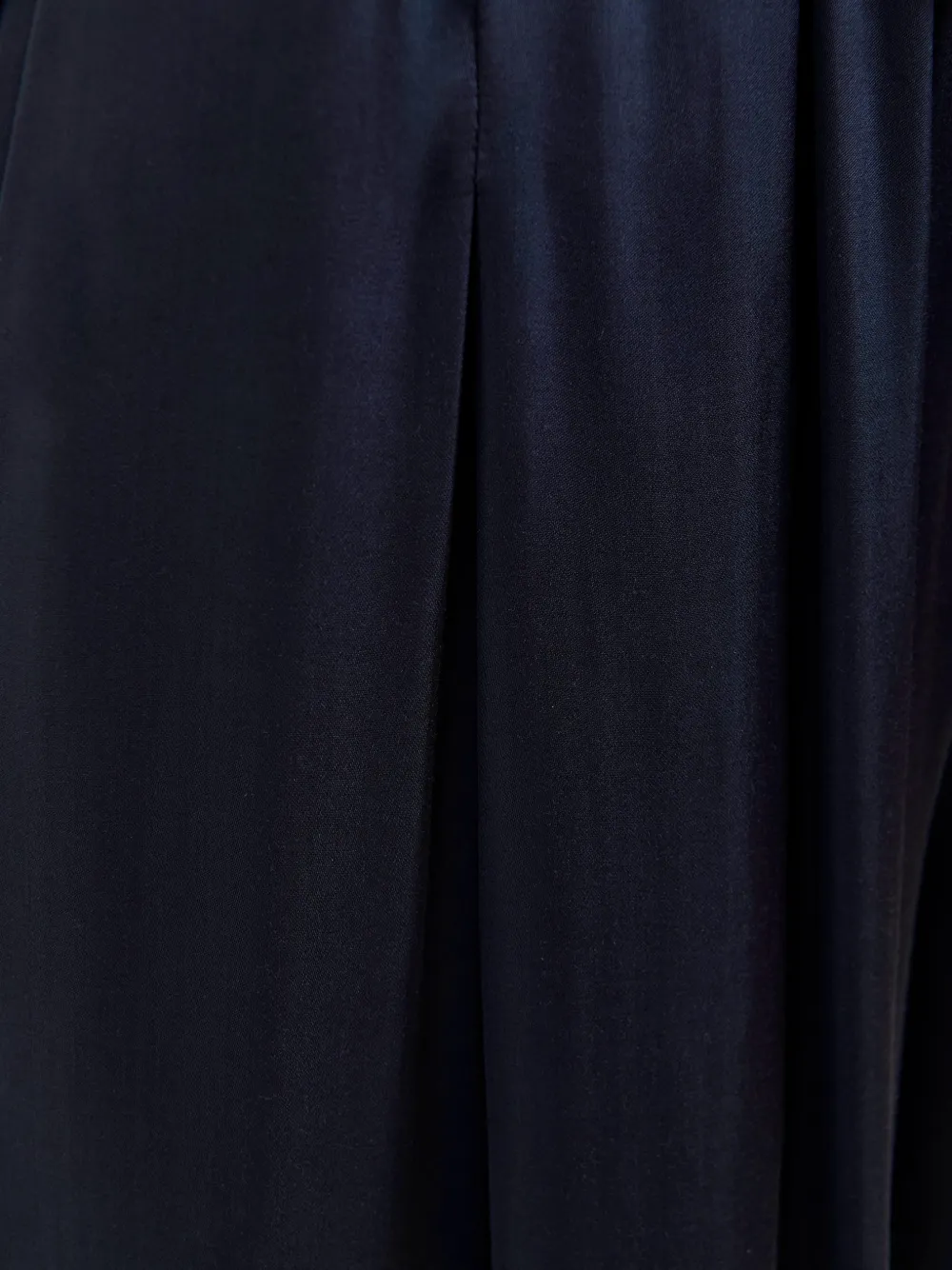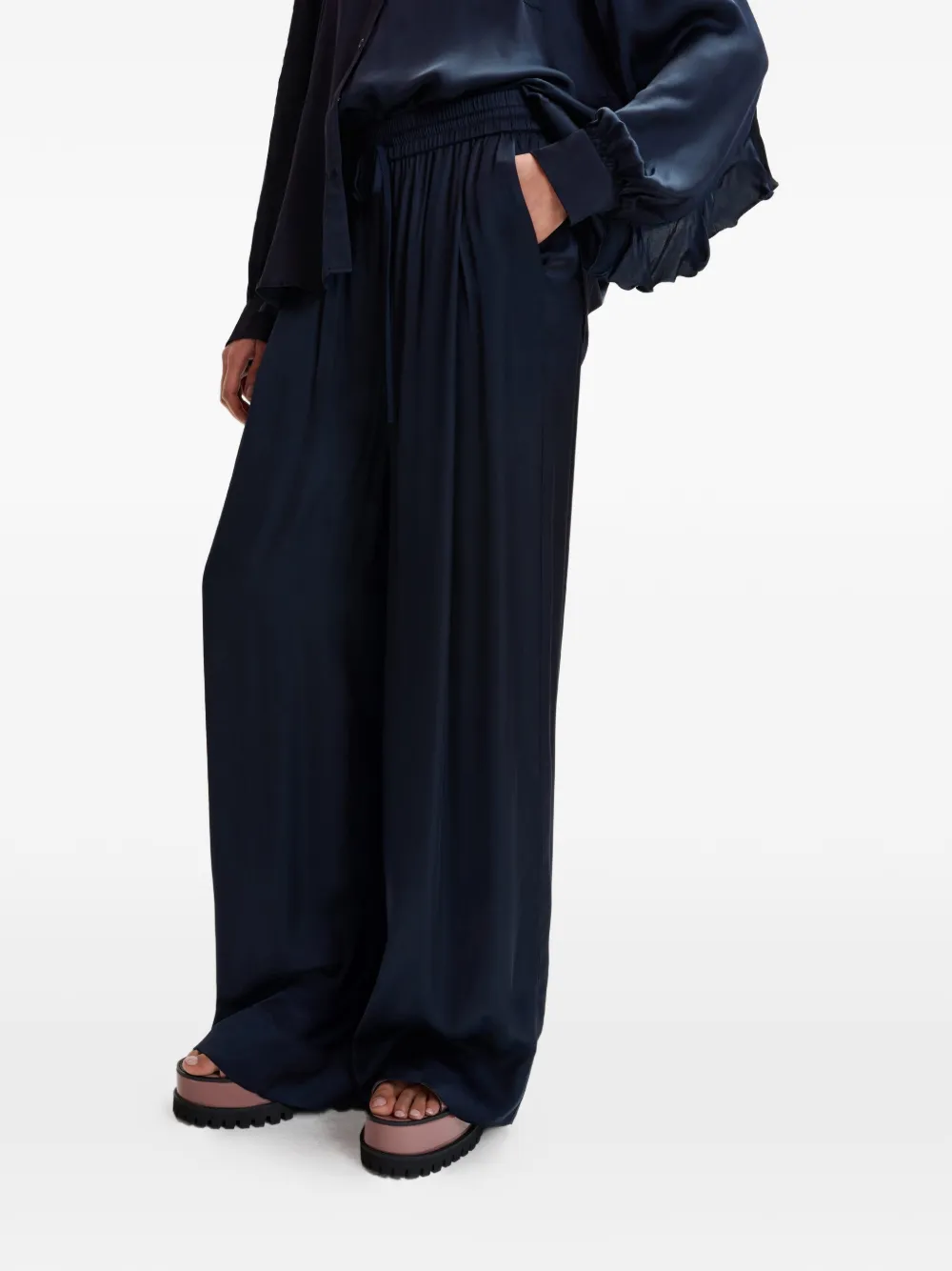 Темно-синий цвет, застежка на шнурке, косые карманы, широкий крой брючин, высокая талия