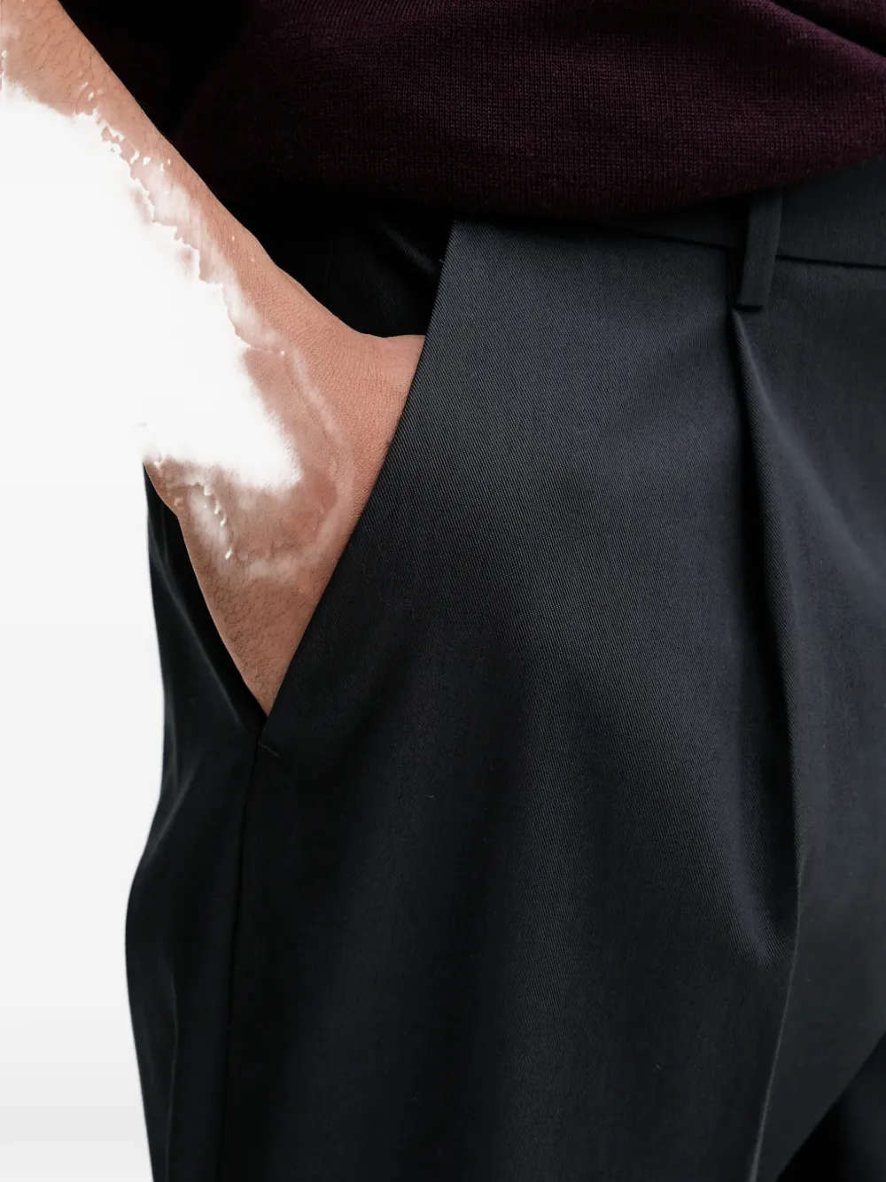 Черные, плиссированная передняя часть, боковые карманы, шлевки для ремня, задние карманы