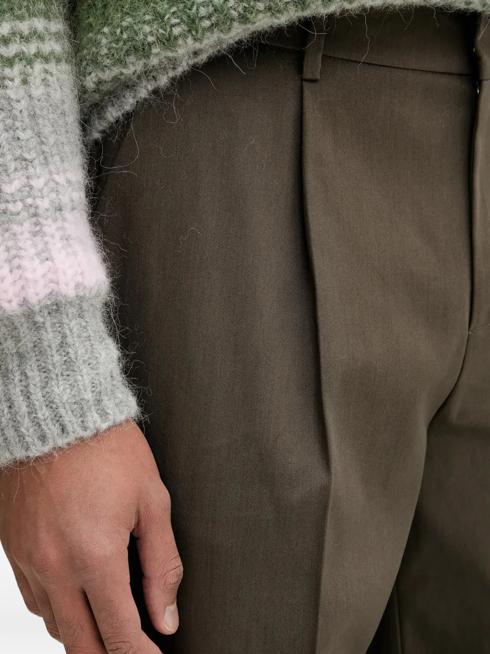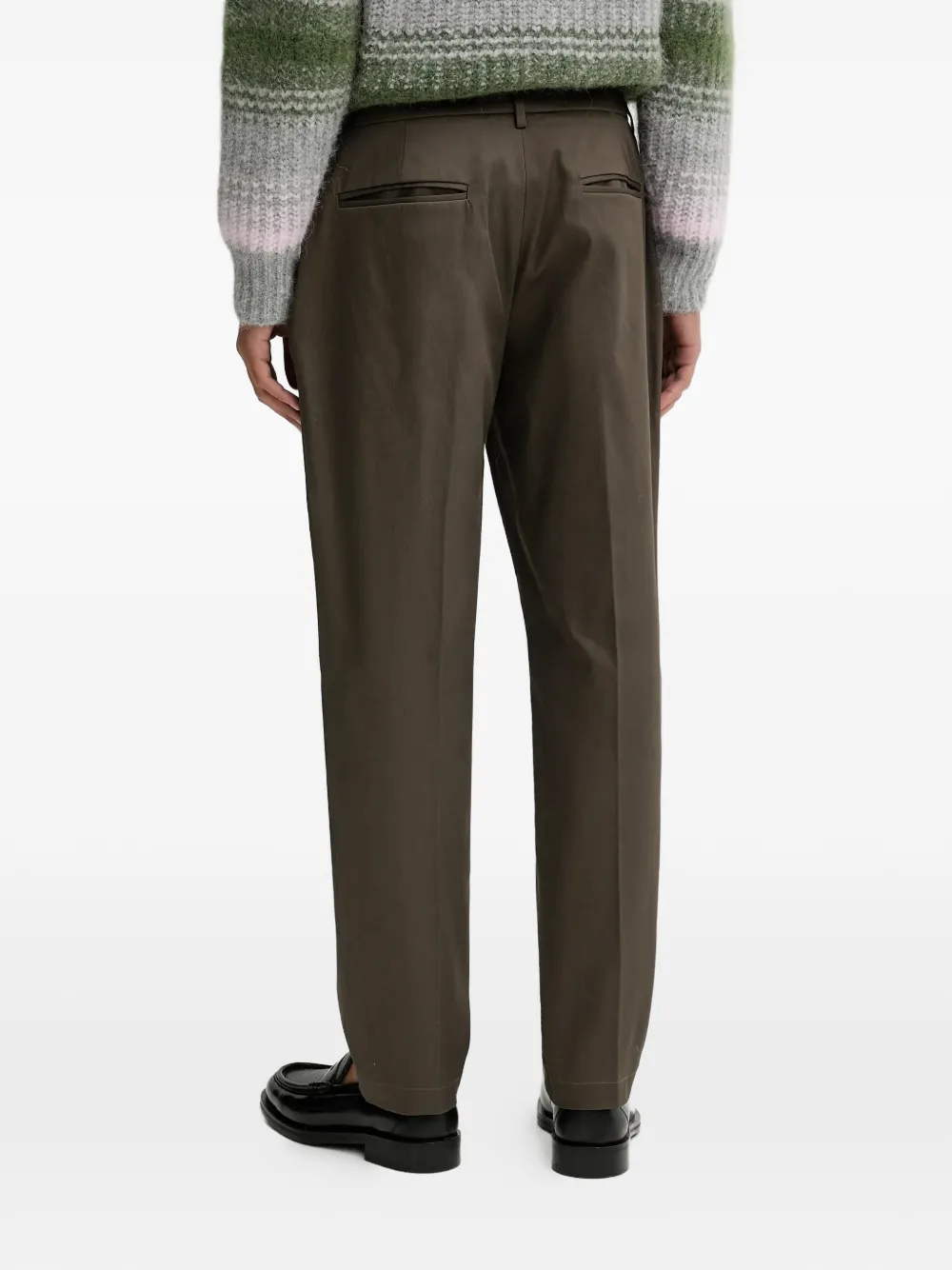 Темно-оливковые брюки с защипами спереди, шлевками для ремня, задними и боковыми карманами