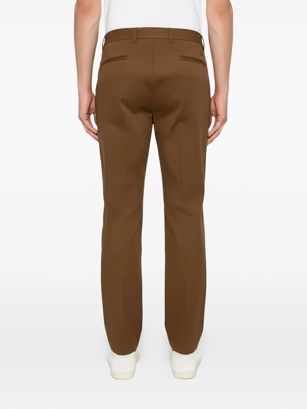 Коричневые шлевки для ремня, потайная молния, боковые карманы в швах, задние прорезные карманы, стрелки