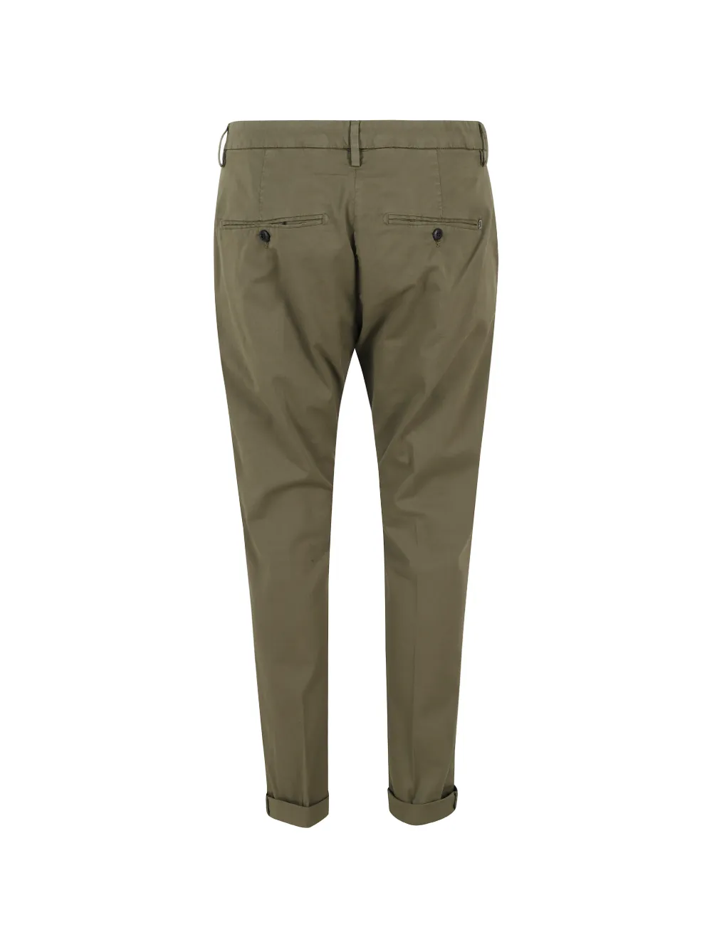 Оливково-зеленый цвет, шлевки для ремня, застежка на пуговицы, задние прорезные карманы, манжеты на брючинах