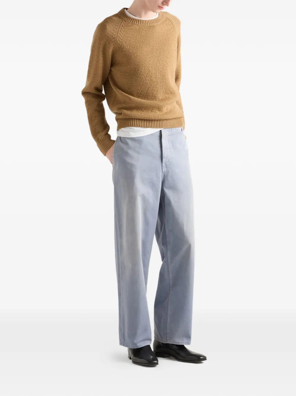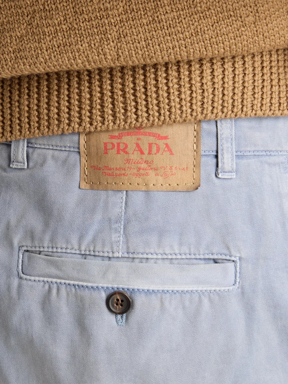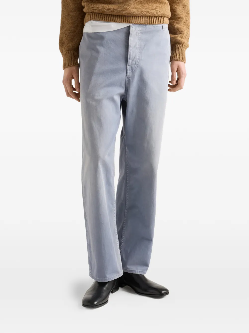 Синие брюки с застежкой на пуговицах, подходящей строчкой, логотипом и задним карманом
