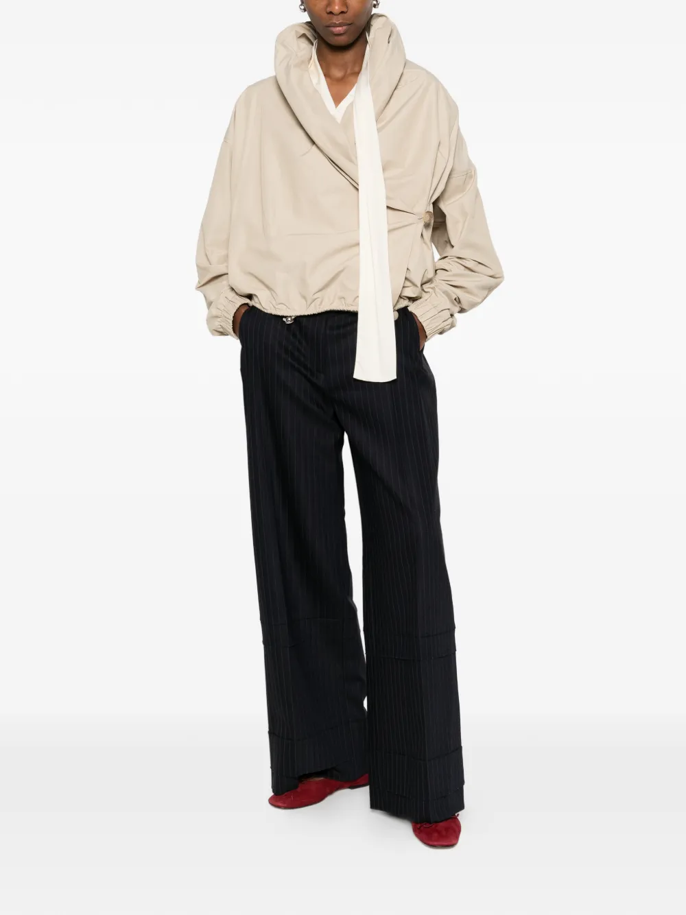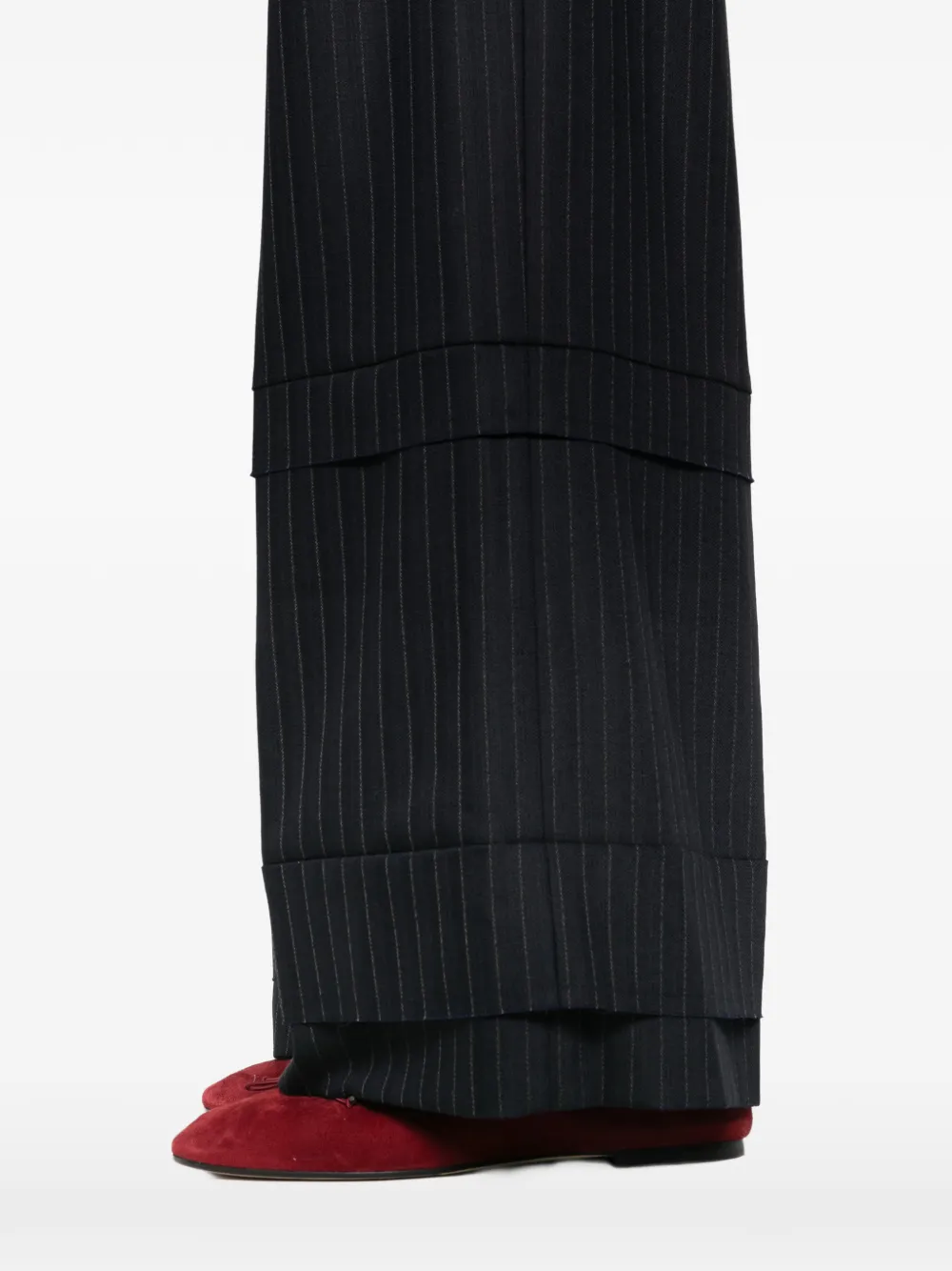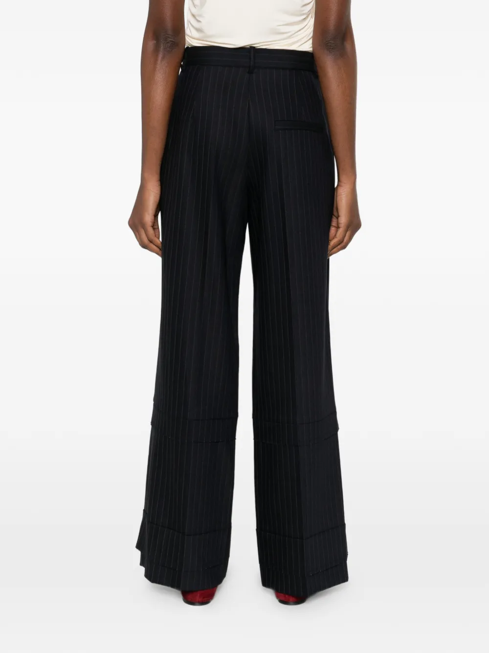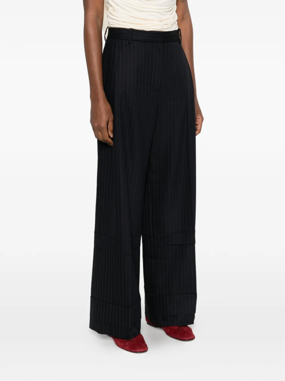 Темно-синий цвет, узор в тонкую полоску, широкие штанины, шлевки для ремня, скрытая застежка