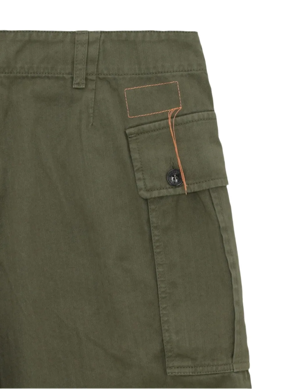 Оливково-зеленый, застегивается на пуговицы, с карманами, шлевками для ремня, тональная строчка