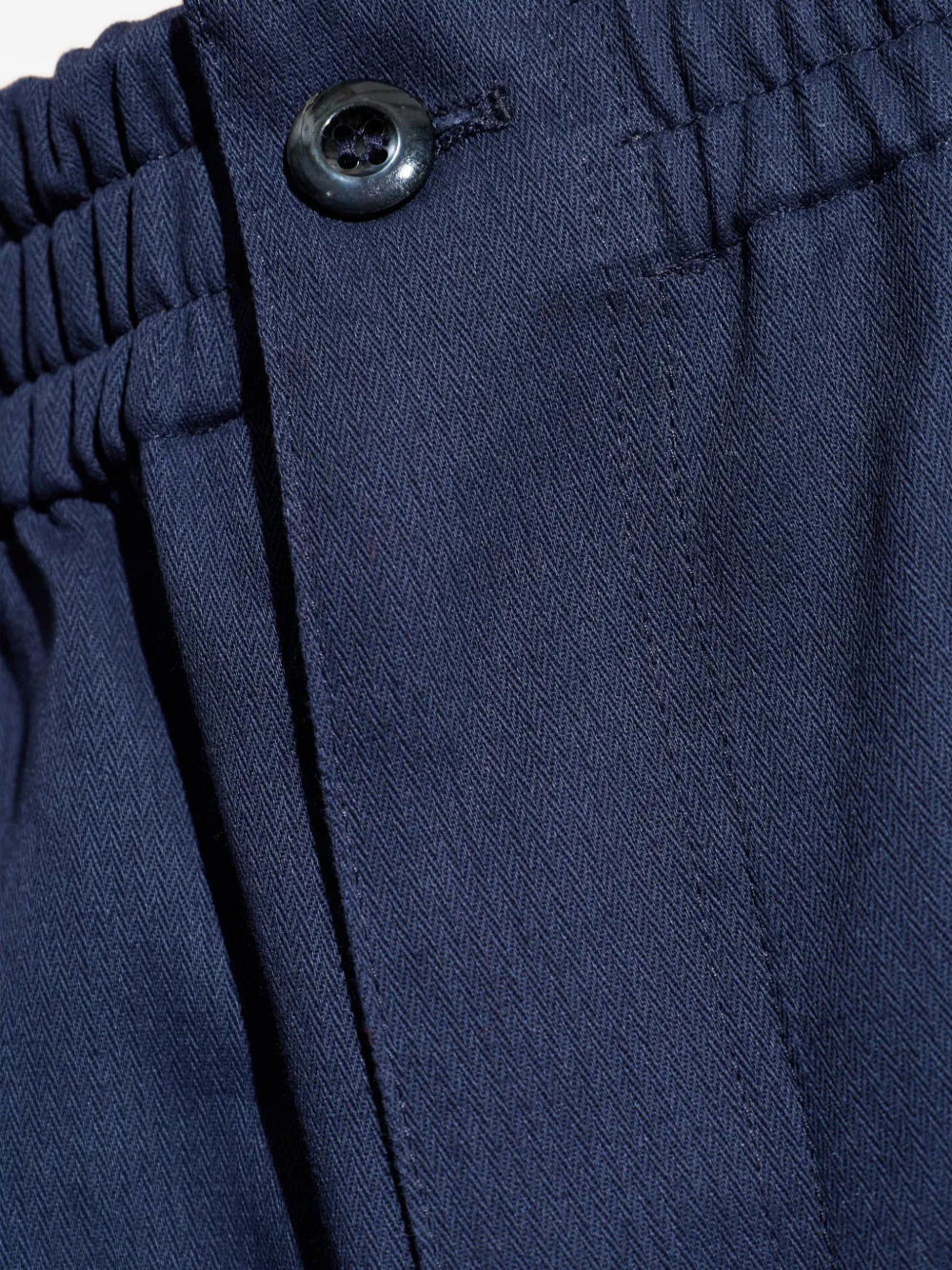 Темно-синий цвет, эластичный пояс, застежка на пуговицы, боковые карманы, задние прорезные карманы