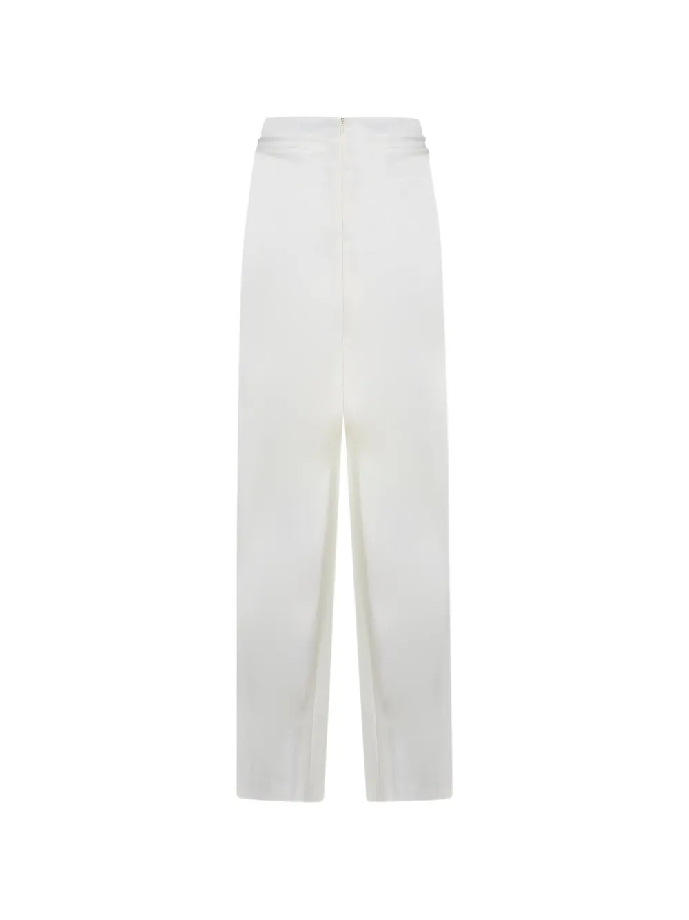 Белый цвет, драпировка на бедрах, асимметричная высокая талия, прямые брючины, застежка-молния сзади