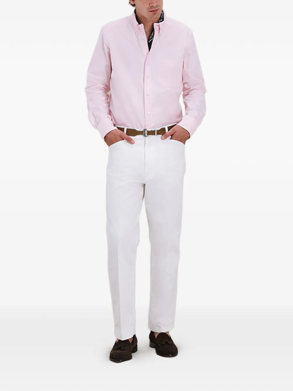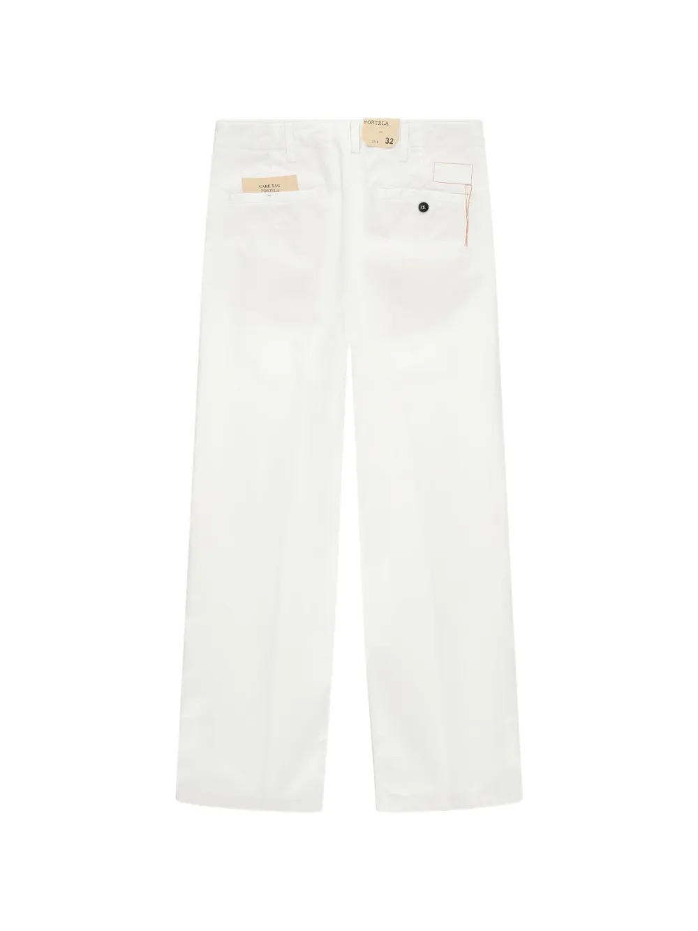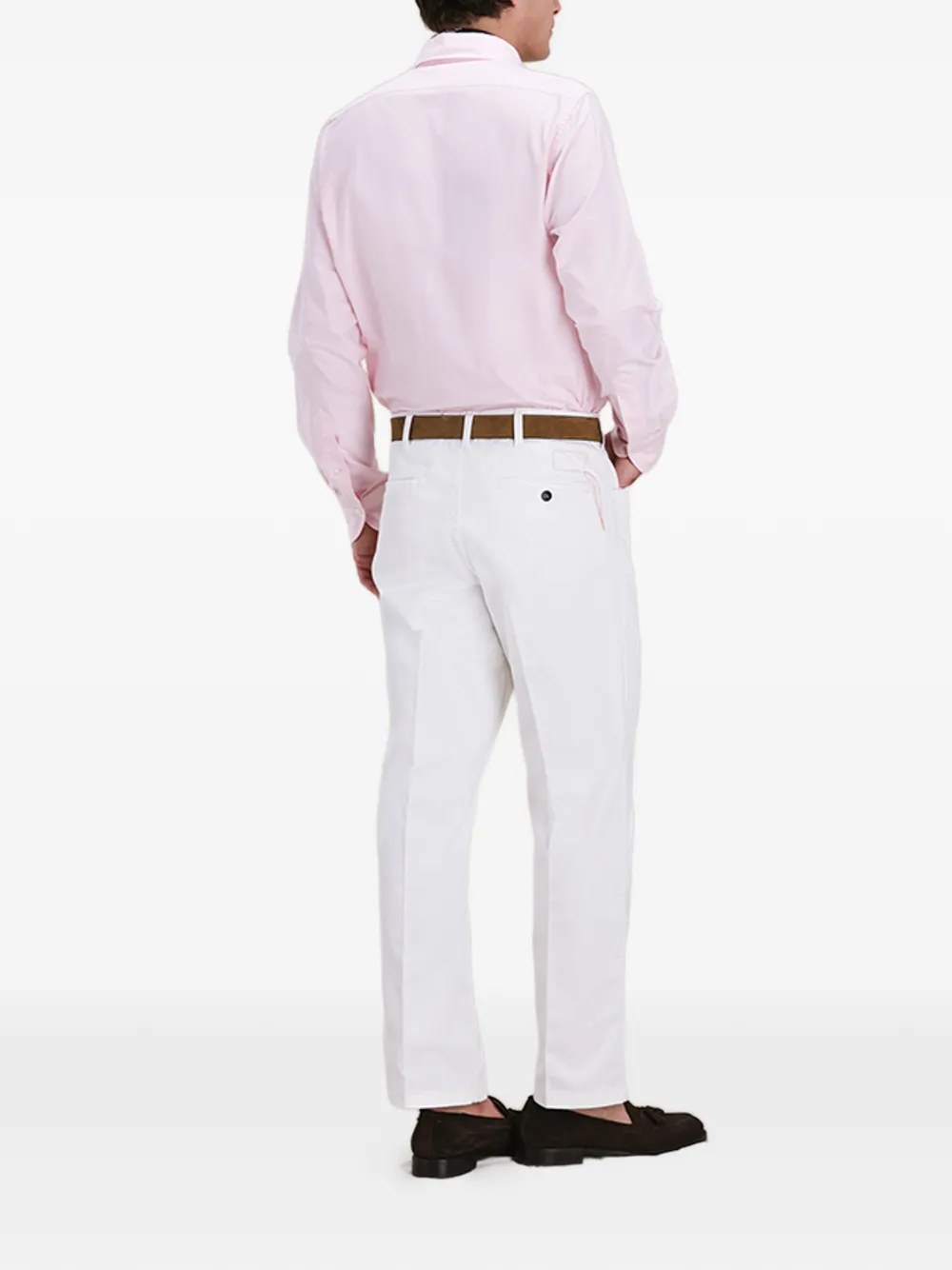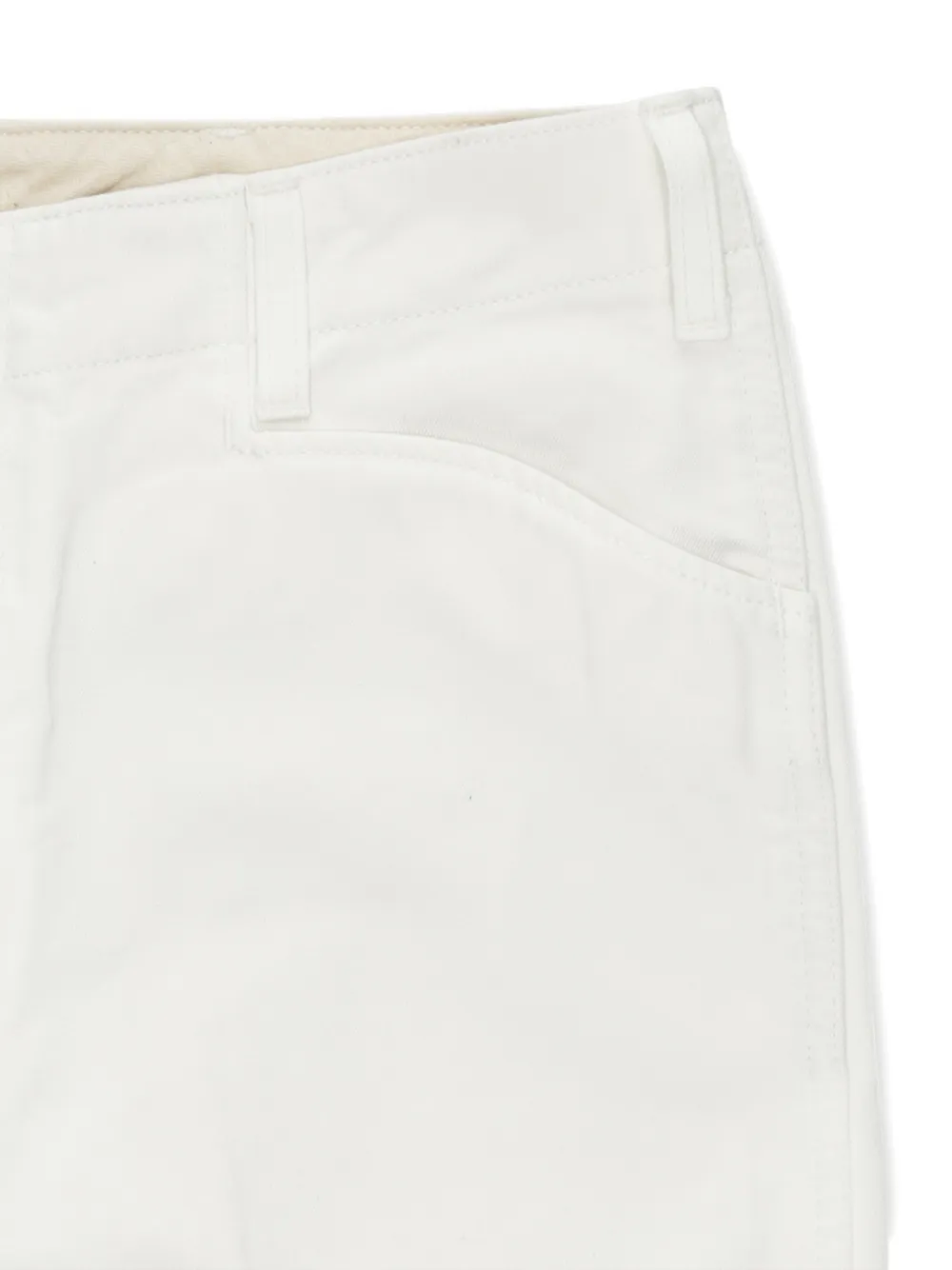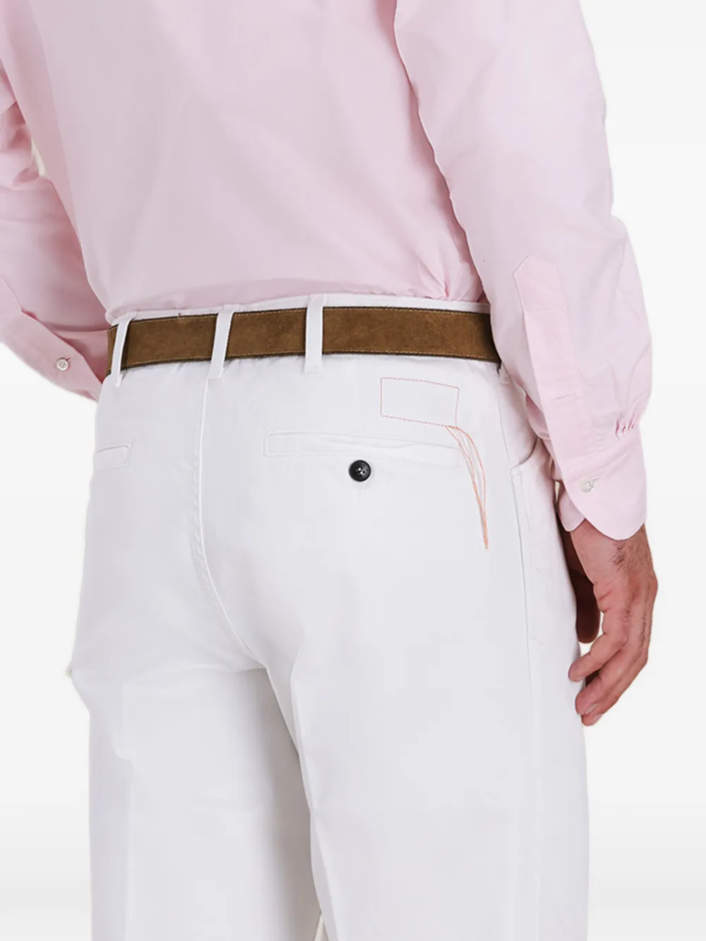 Белые брюки с текстурой холста, застежкой на пуговицы, шлевками для ремня, прорезными карманами спереди и сзади