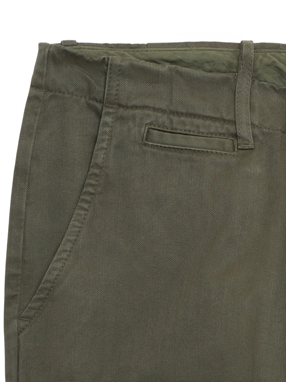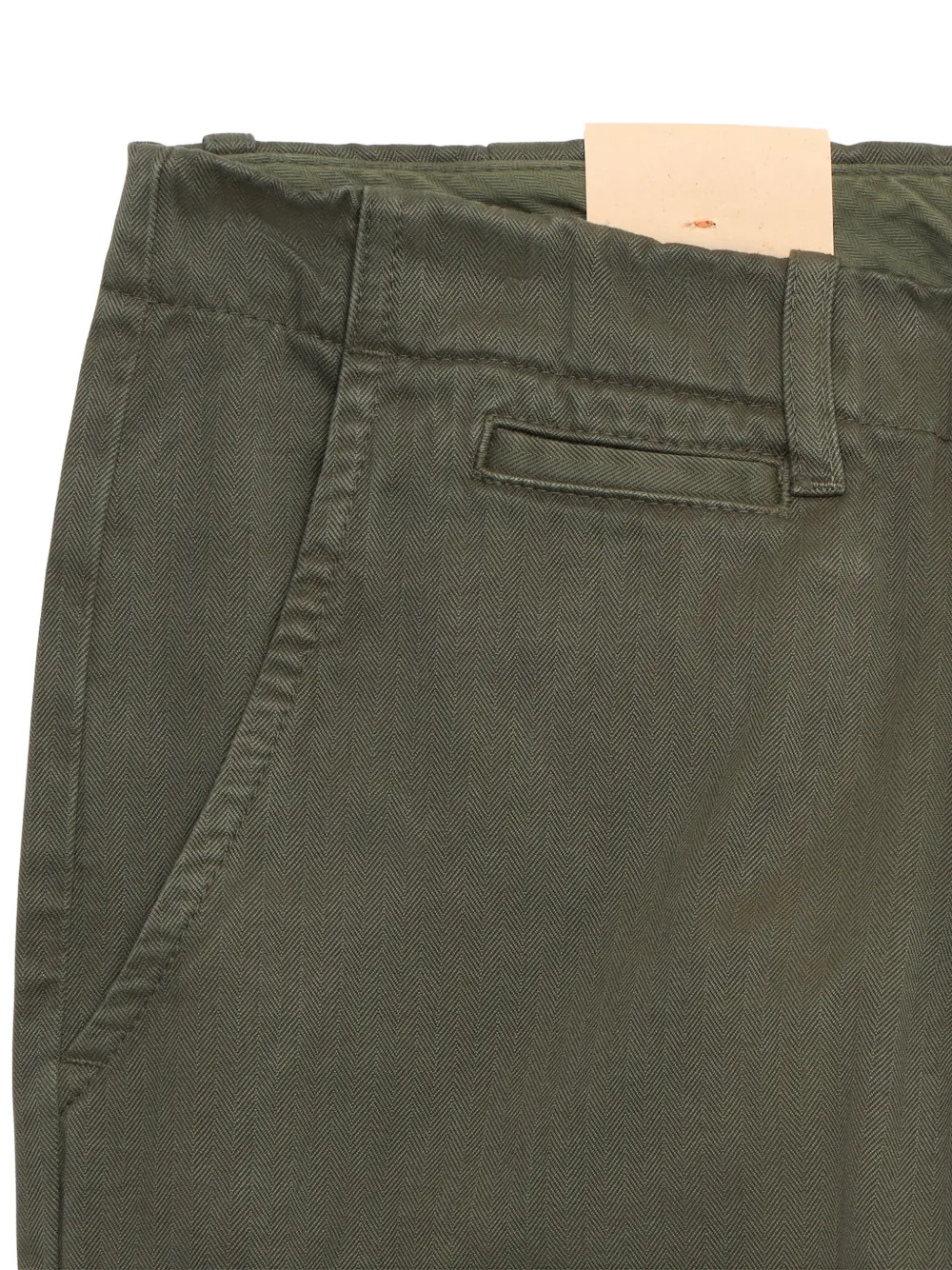 Зеленый елочный узор, застежка на пуговицы, задний прорезной карман, передний карман с клапаном, шлевки для ремня
