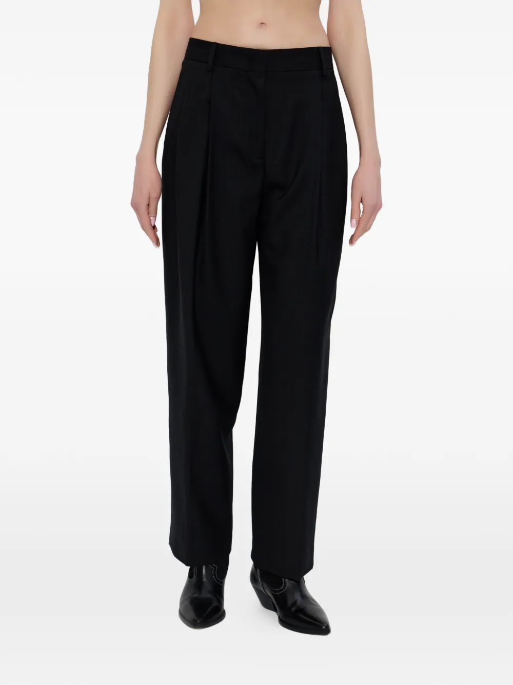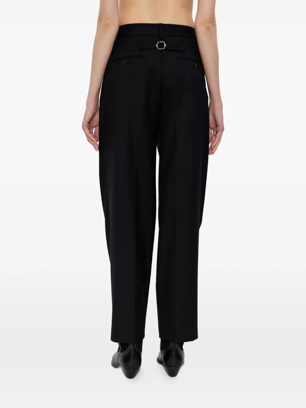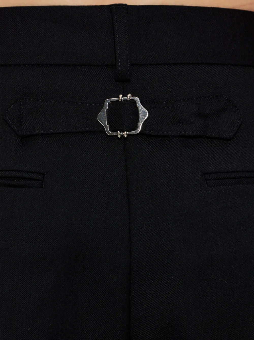 Черные, регулируемый ремешок сзади, шлевки для ремня, складки спереди, боковые прорезные карманы, задние карманы с листочкой
