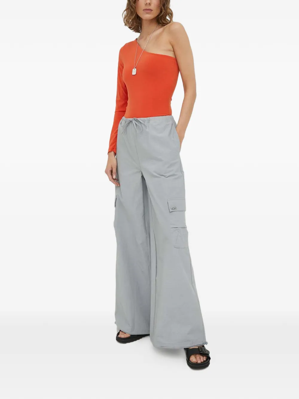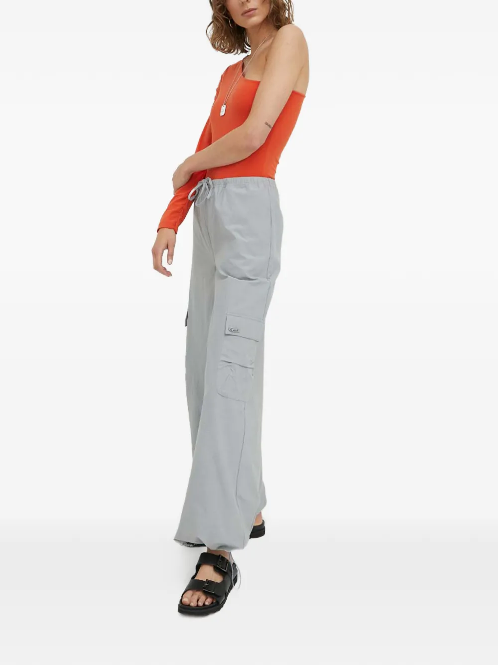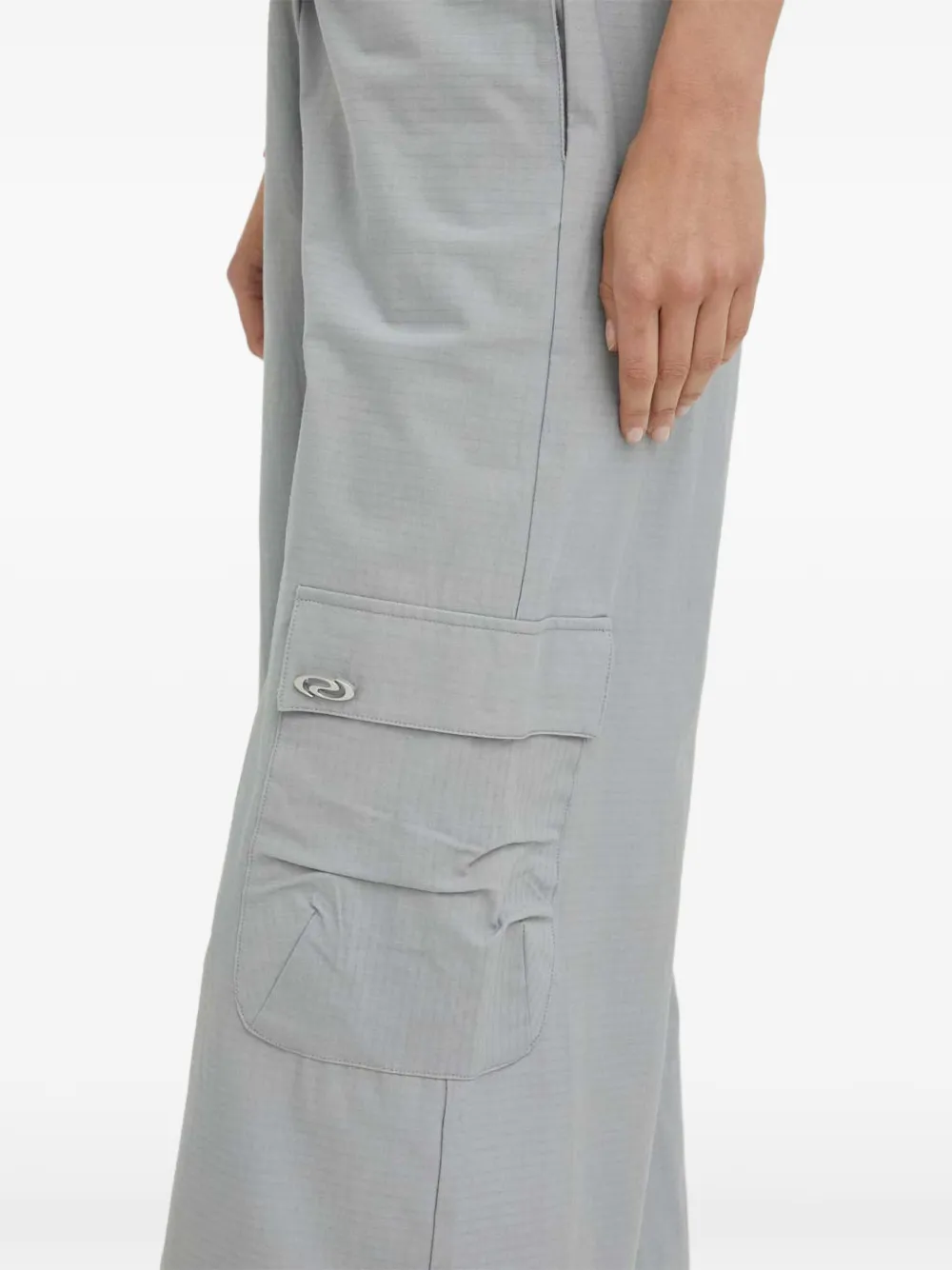 Светло-серые широкие брюки с боковыми карманами-карго, кулиской на талии, логотипом и карманами с клапаном