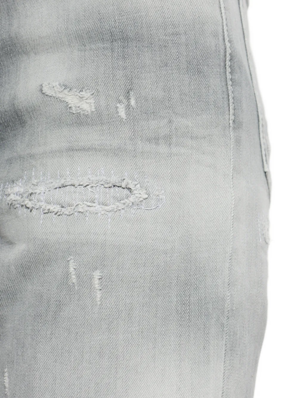 Серый цвет с эффектом поношенности, необработанный край, пять карманов, шлевки для ремня, застежка на пуговицах