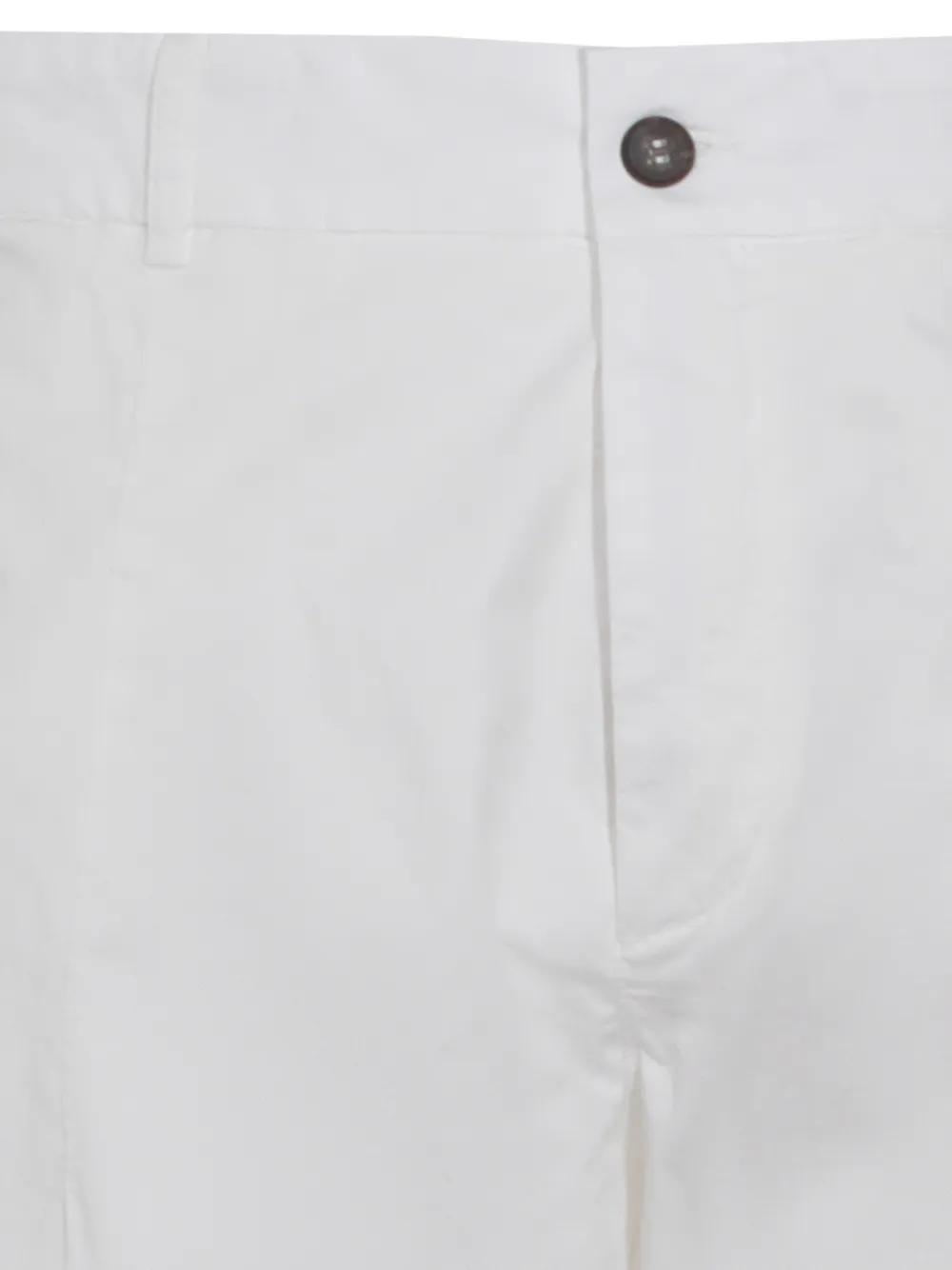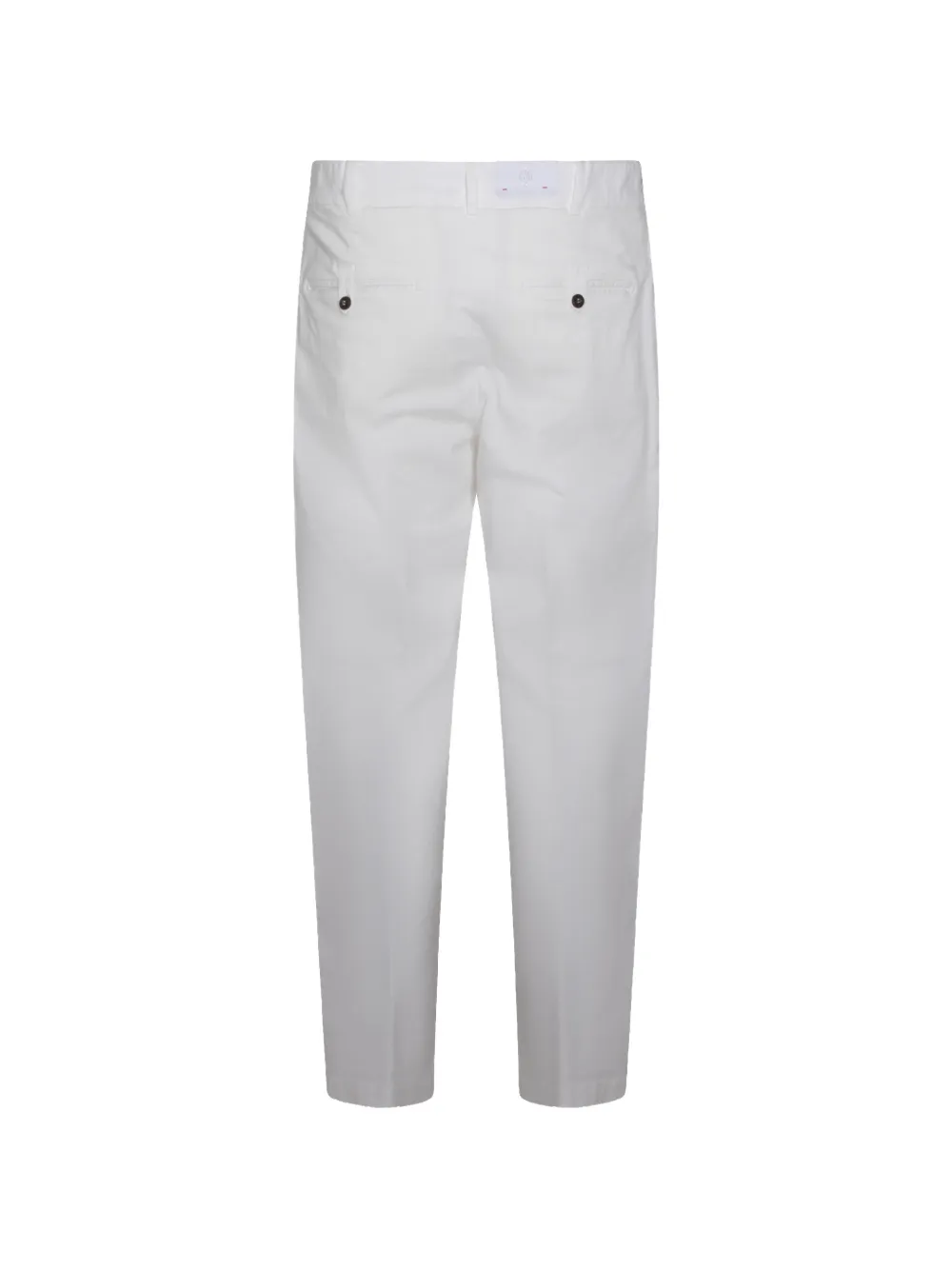 Белые брюки с застежкой на пуговицы, шлевками для ремня, защипами спереди и прорезным карманом сзади