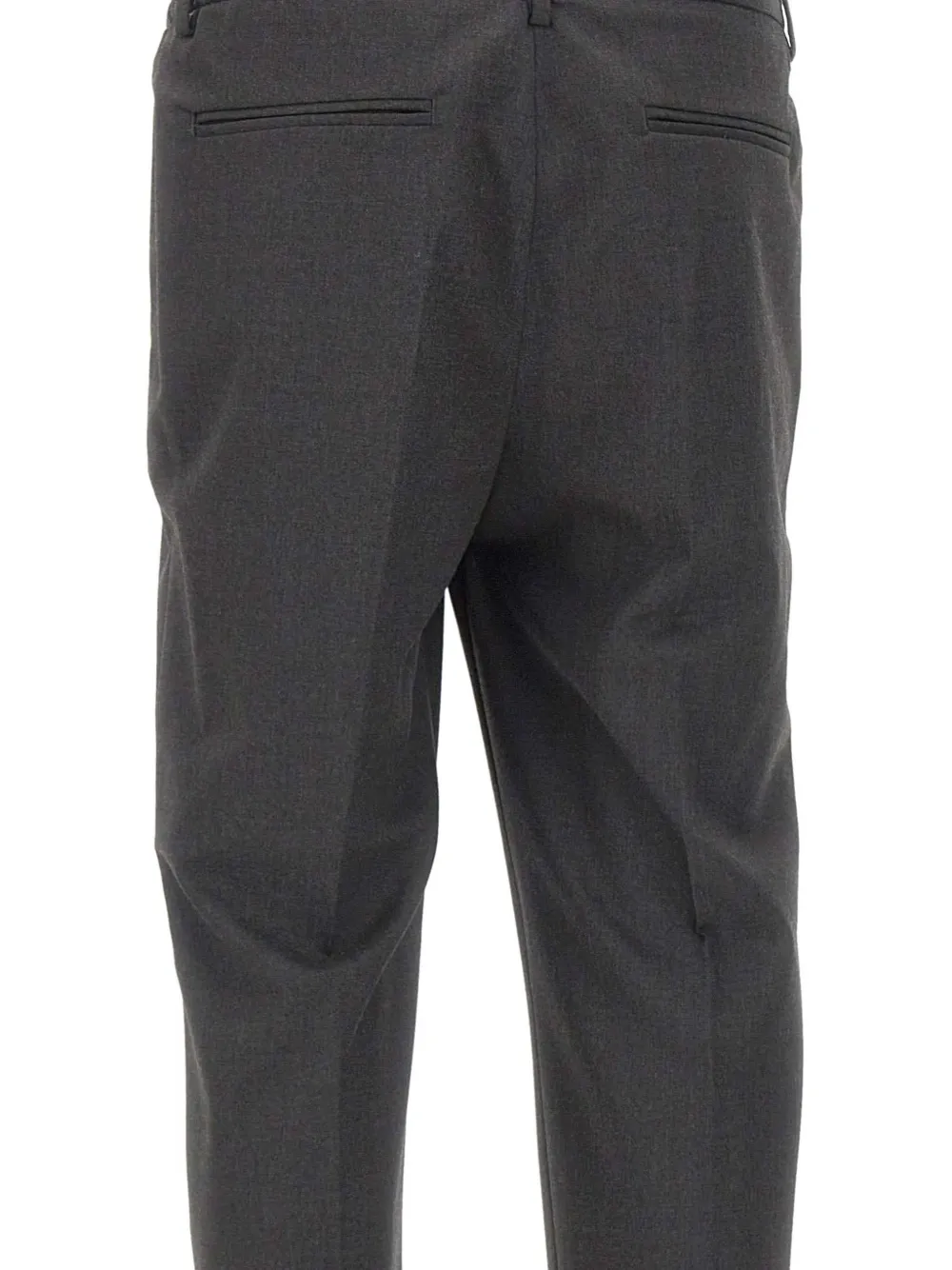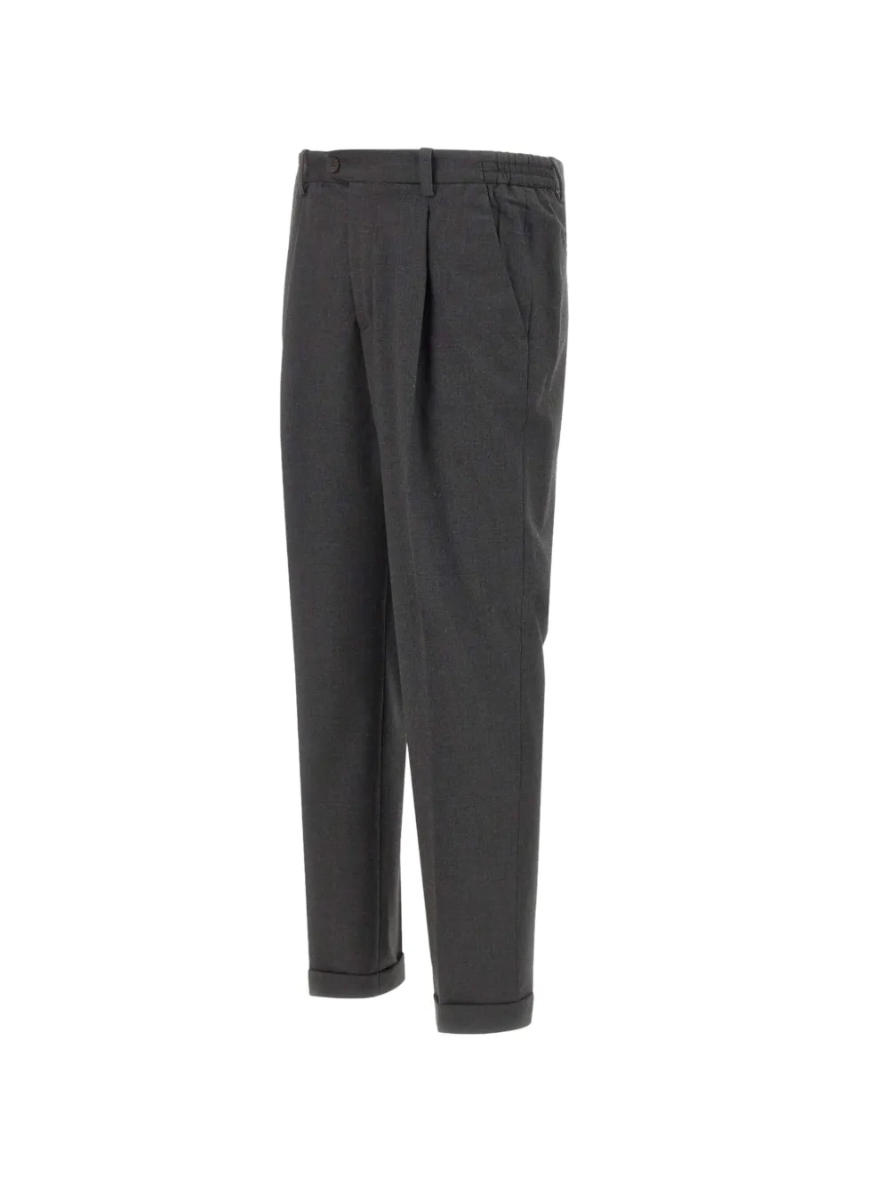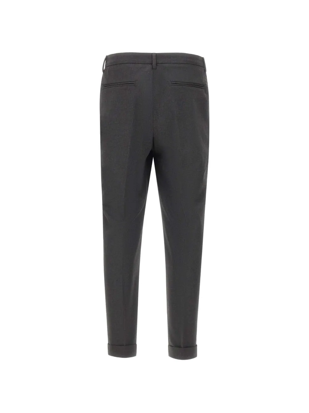 Темно-серый, складки спереди, прорезные карманы сзади, застежка на пуговицу