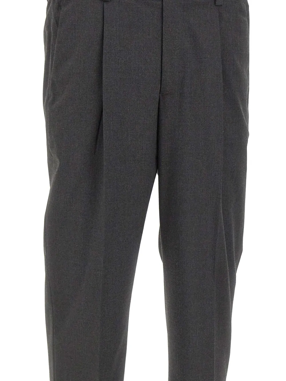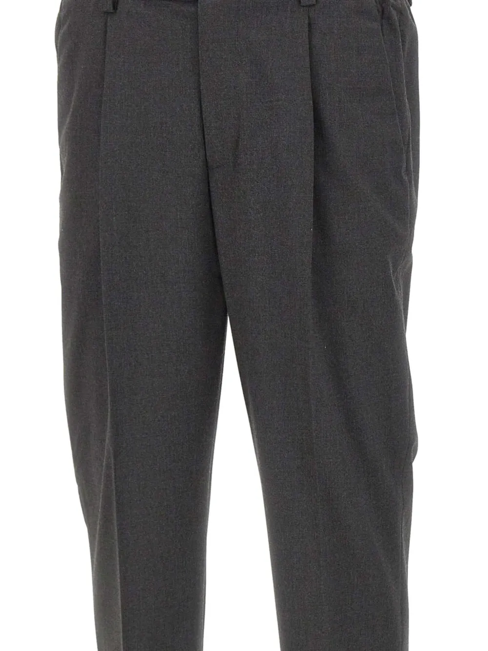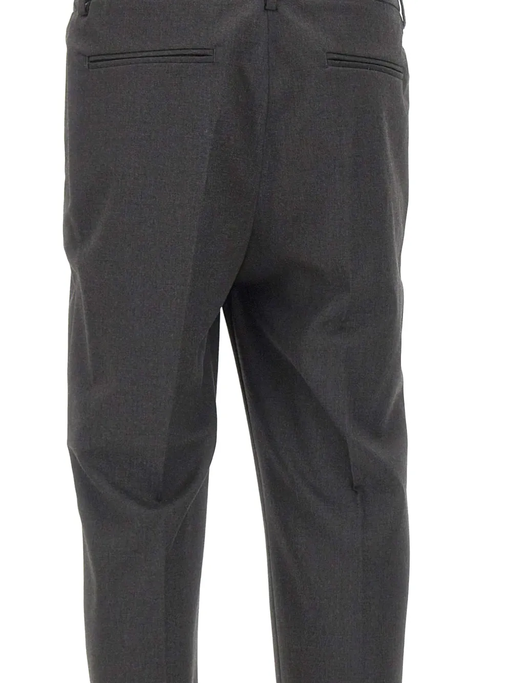 Темно-серый, складки спереди, прорезные карманы сзади, застежка на пуговицу