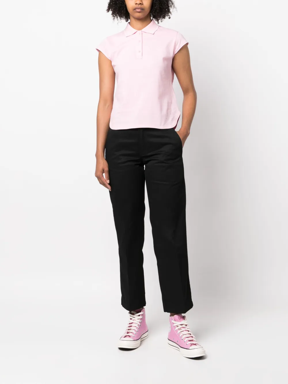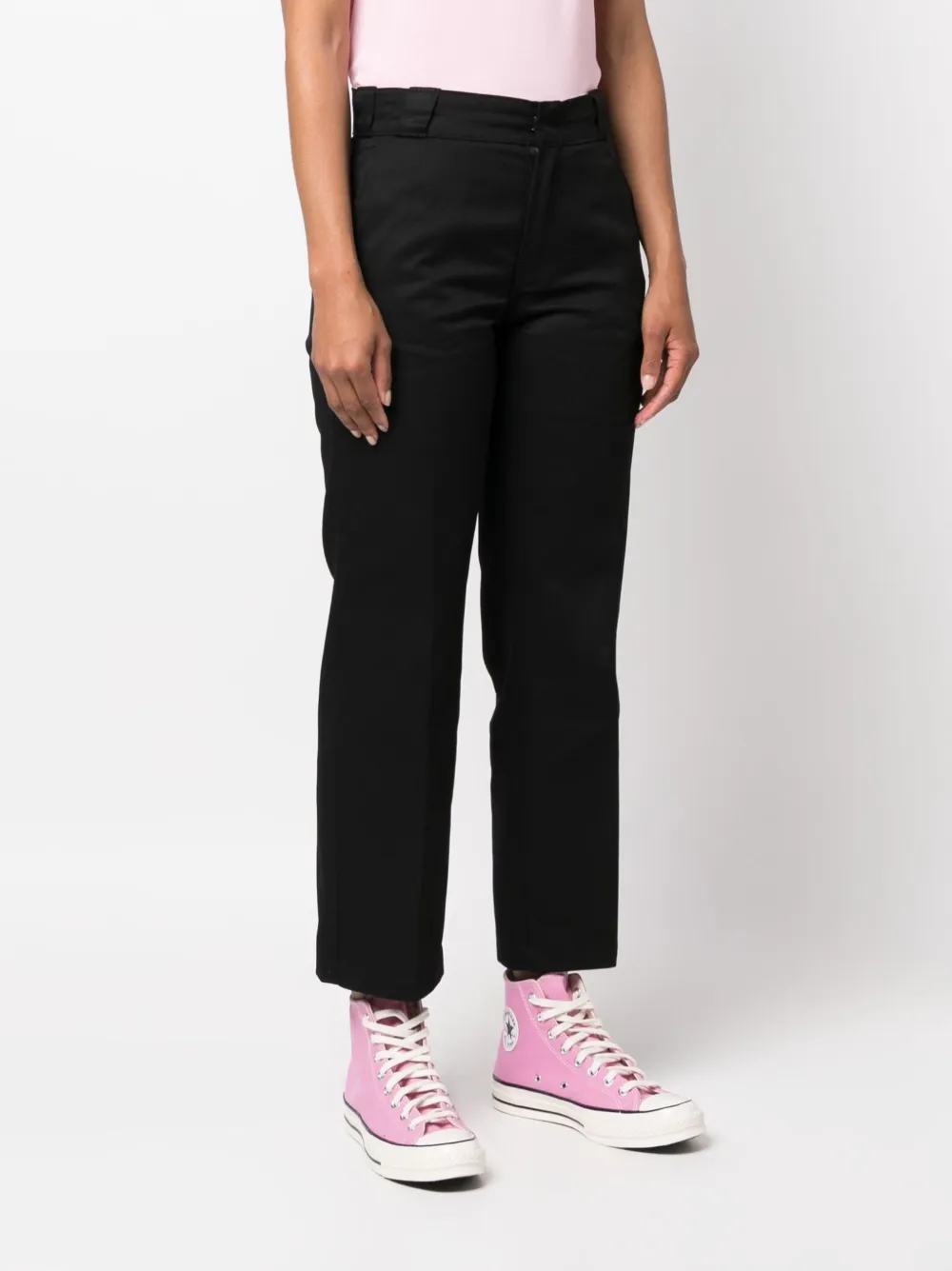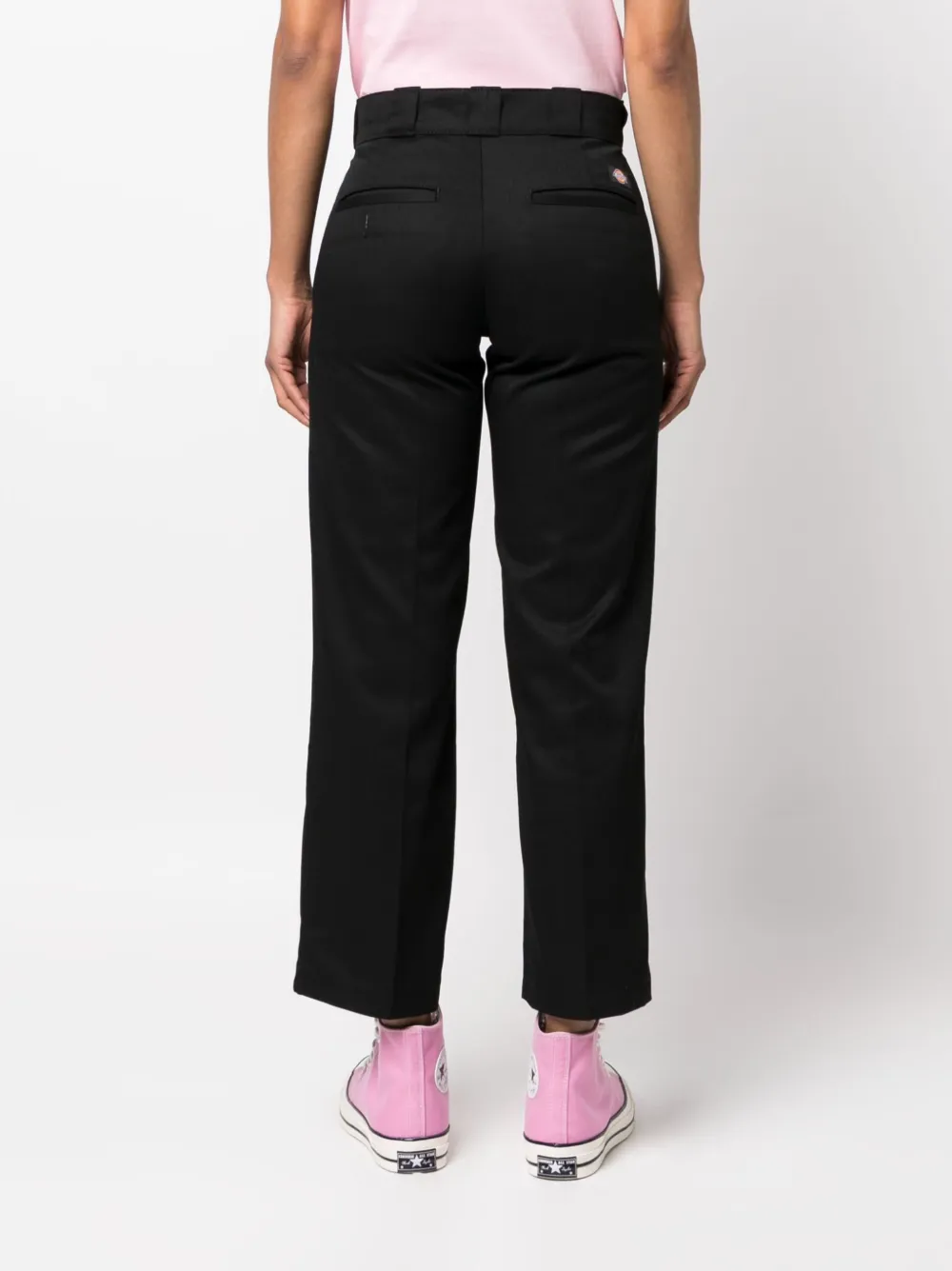 Черный, хлопок, нашивка с логотипом сзади, средняя посадка, петли для ремня, два вшитых кармана по бокам, два прорезных кармана сзади, прямой крой и укороченная длина.