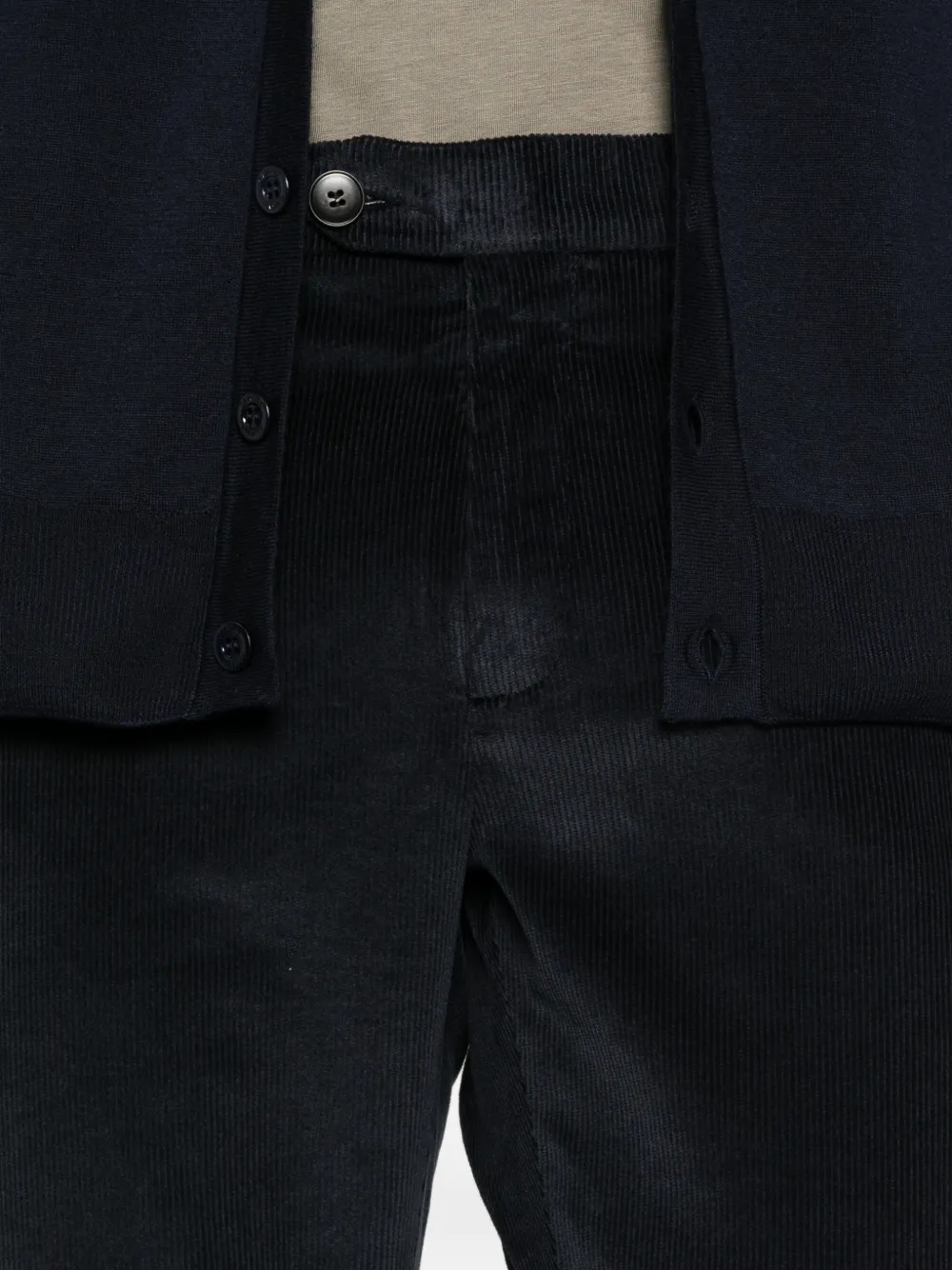 Синяя вельветовая фактура, застежка на пуговицы, шлевки для пояса, прорезные карманы, карманы с листочкой
