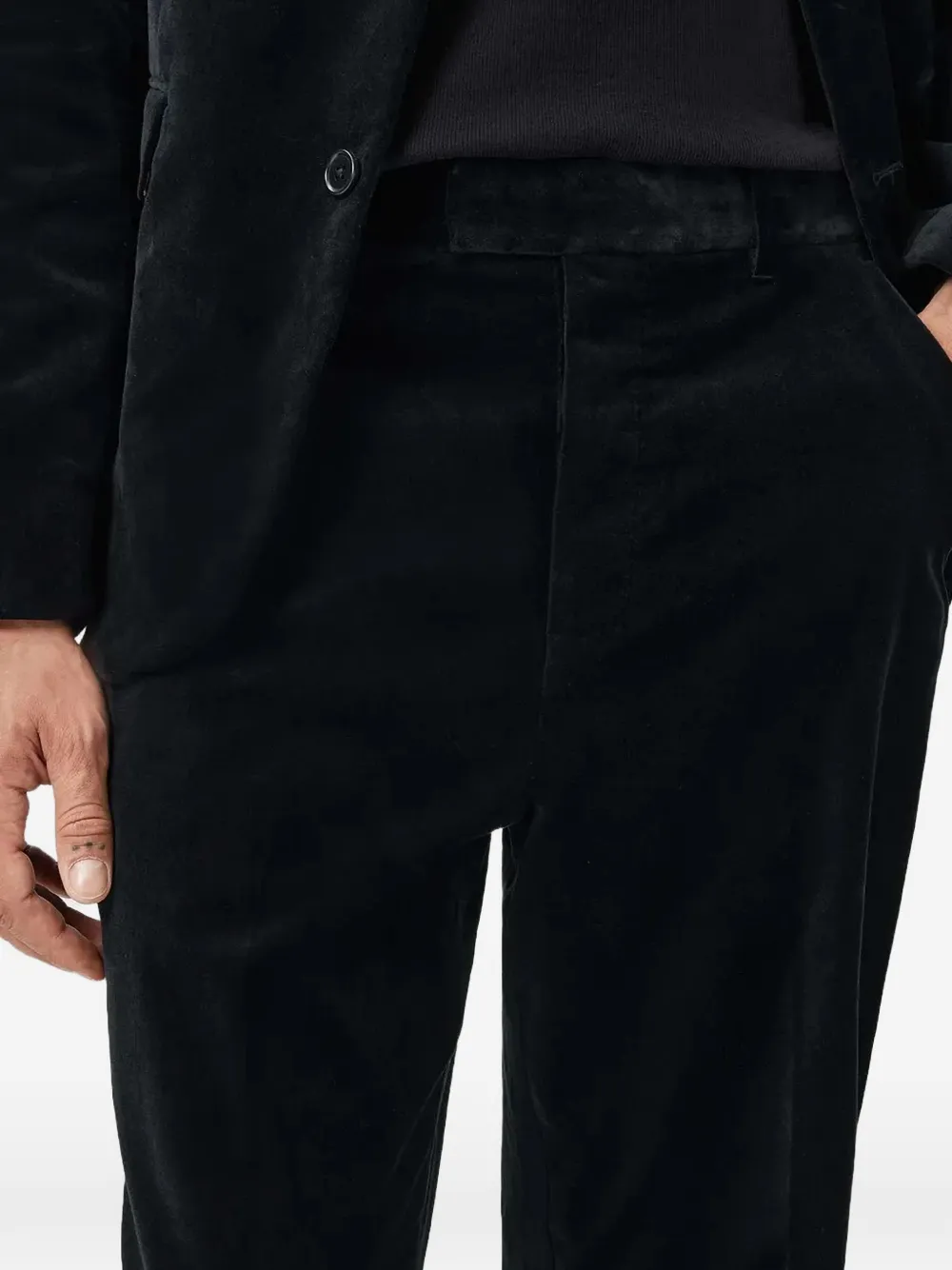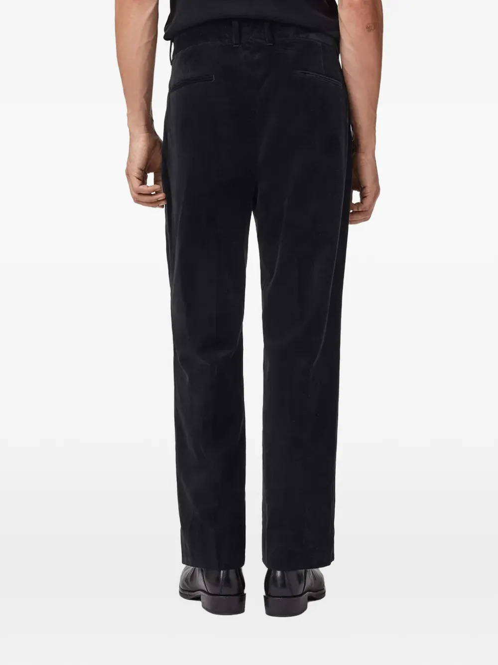 Черные шлевки для ремня, боковые прорезные карманы, задние прорезные карманы, потайная застежка спереди, прямые брючины