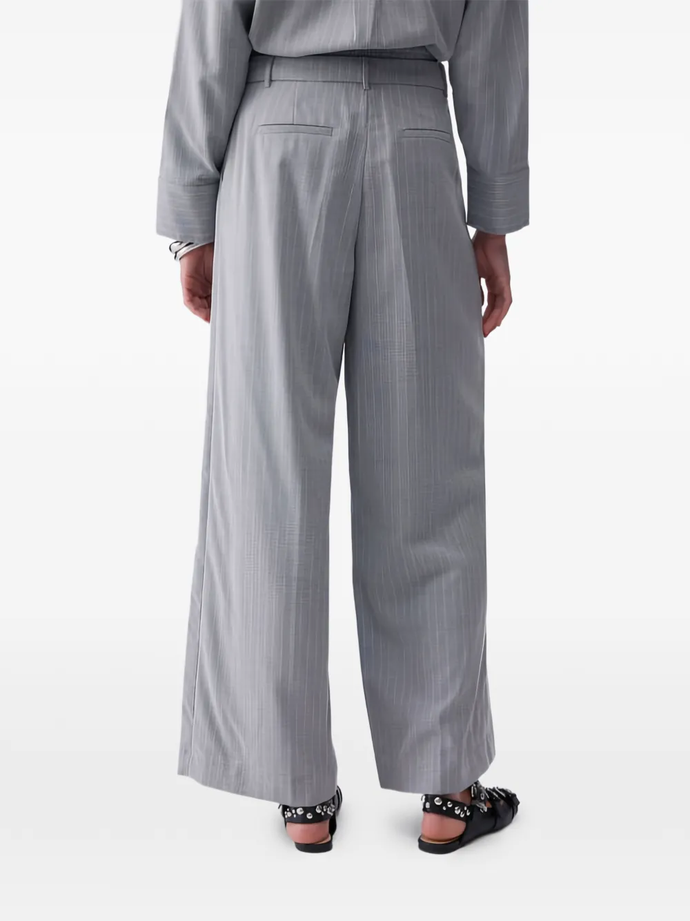 Серый цвет с полосатым узором, застежка на пуговицы, шлевки для пояса, задний прорезной карман