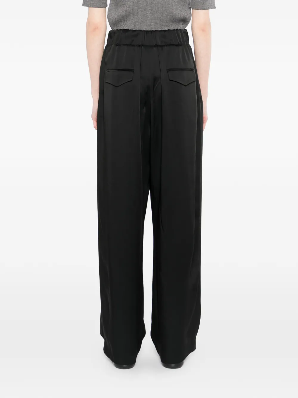 Черный цвет, эластичный пояс, два боковых прорезных кармана, два задних кармана с клапанами