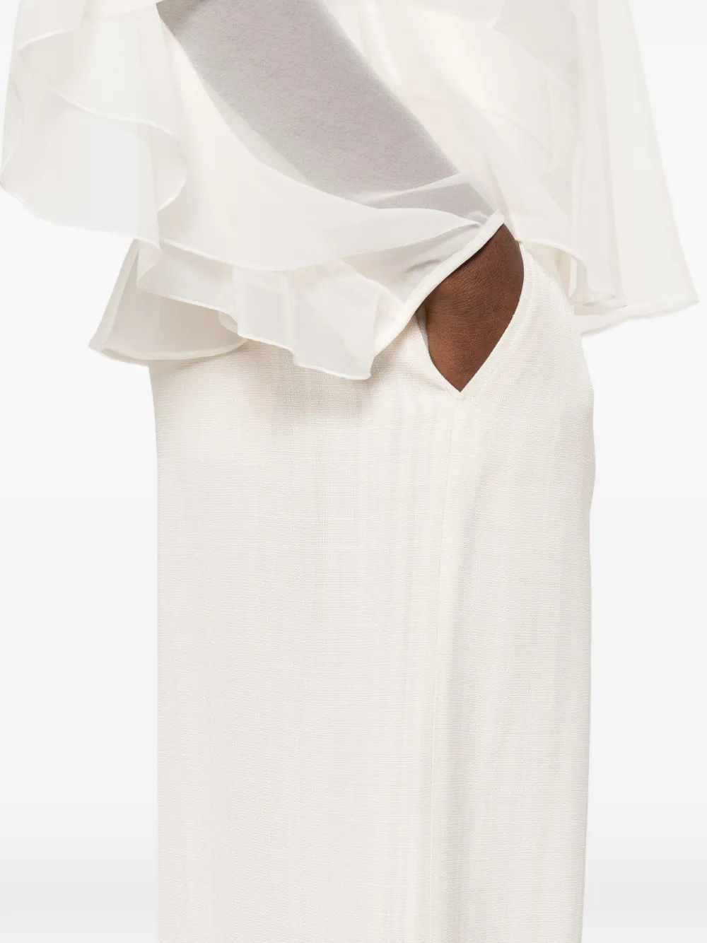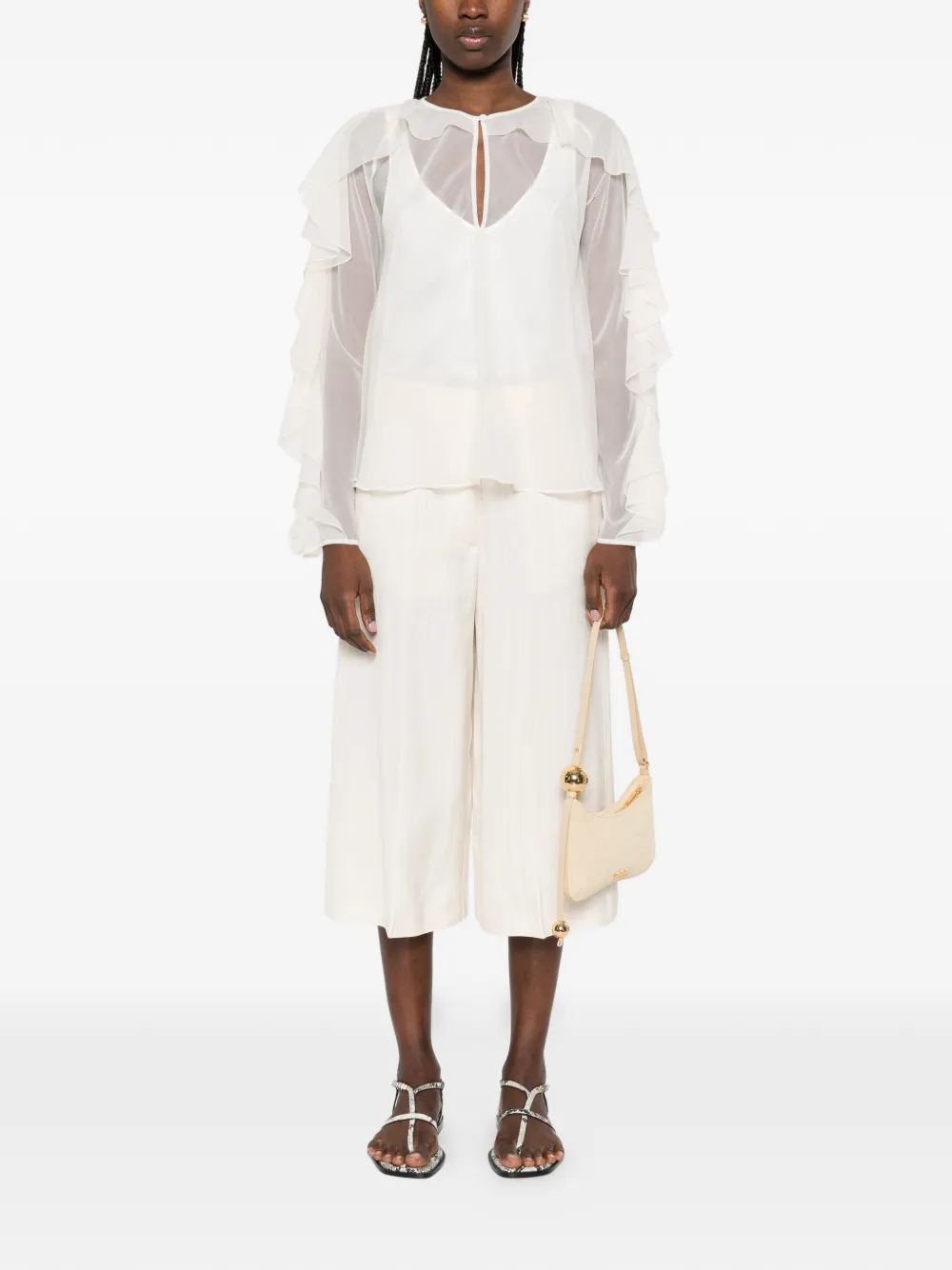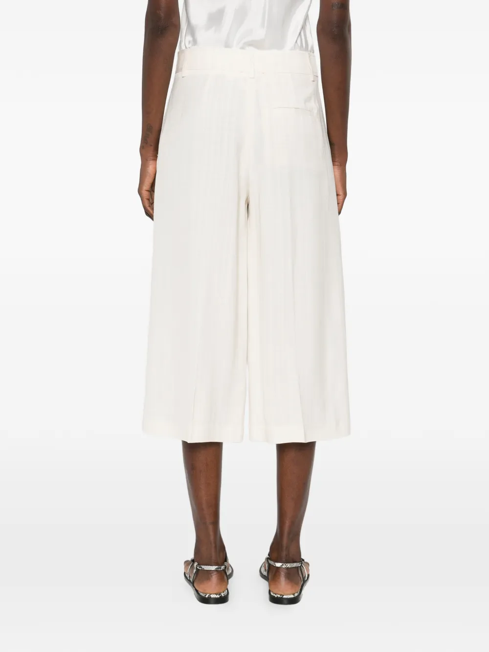 Кремового цвета, боковые карманы, шлевки для ремня, широкие брючины