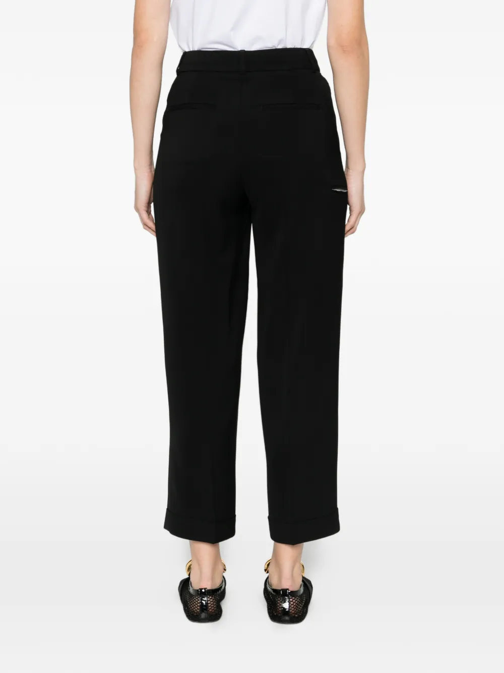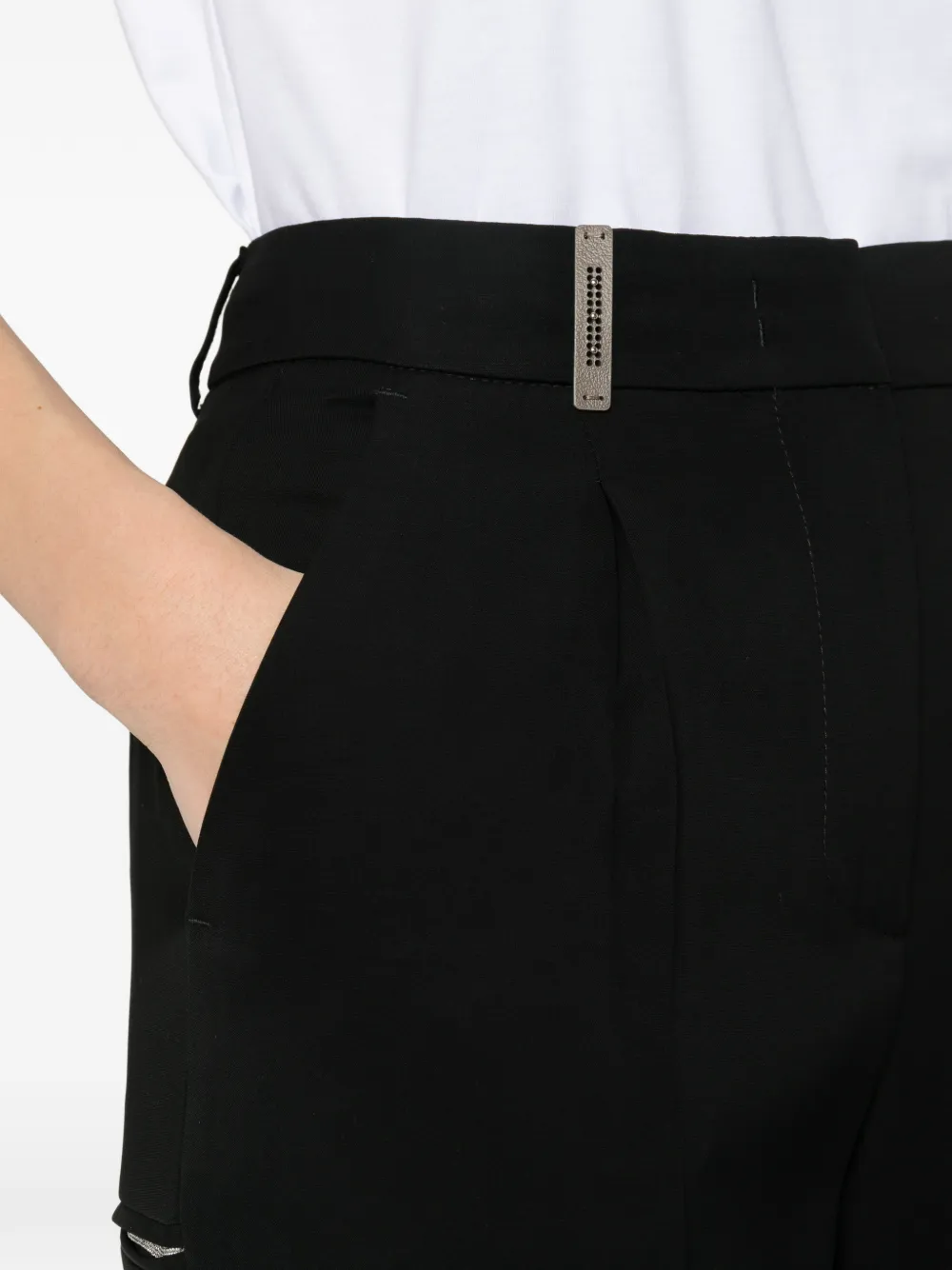 Черные брюки с защипами спереди, отворотами на манжетах, пластиной с логотипом, боковыми карманами и скрытой застежкой