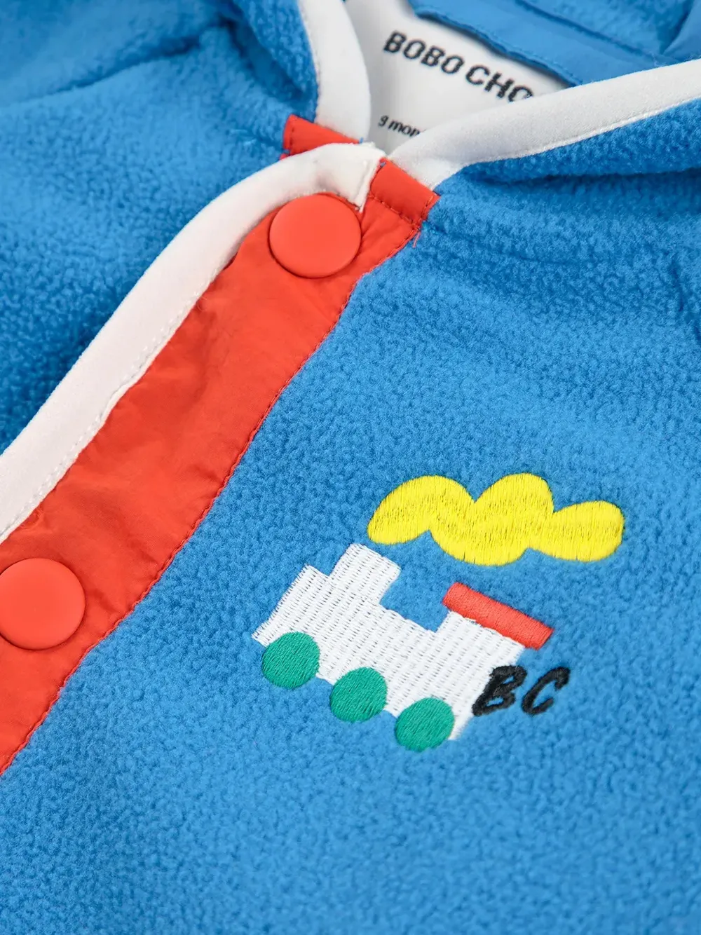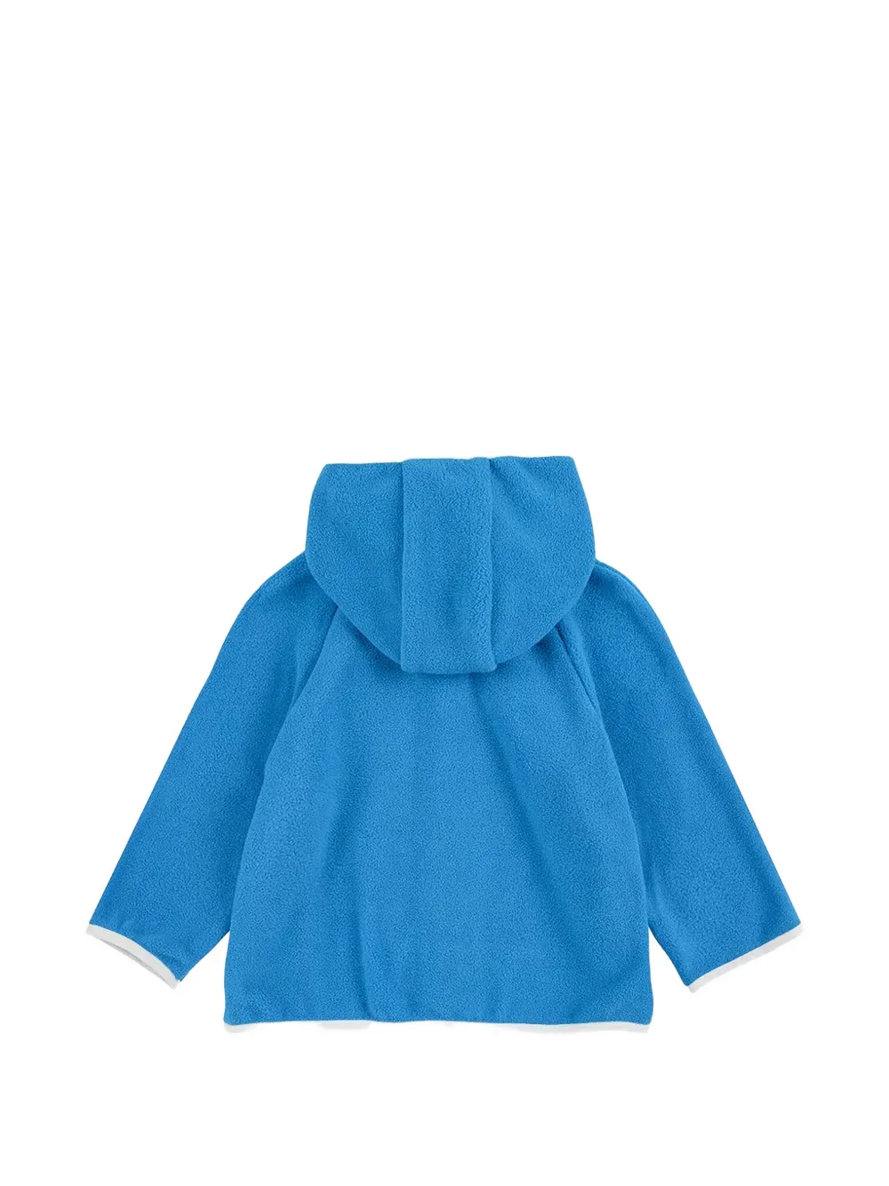 Синяя толстовка с аппликацией на капюшоне, застежкой на пуговицы спереди, длинными рукавами и накладными карманами спереди. Без белой окантовки.