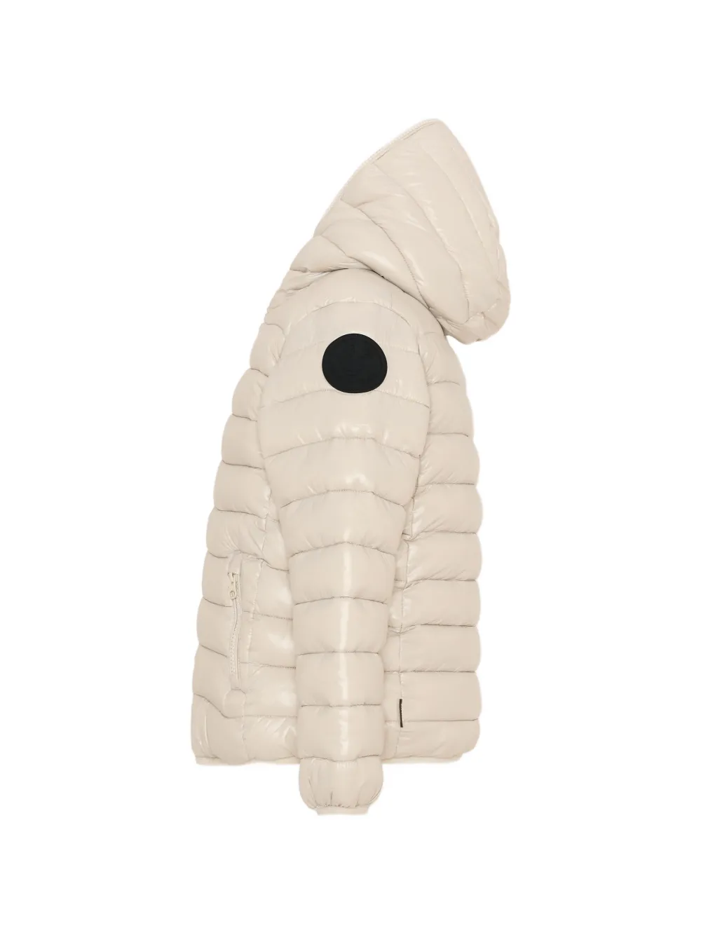 Бежевый стеганый дизайн, капюшон, застежка-молния, боковые карманы на молнии, нашивка с логотипом на рукаве
