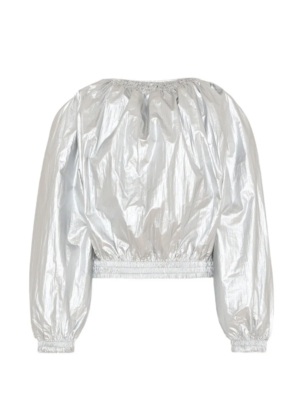 Серебристый цвет, сборка на вырезе, застежка-молния спереди, длинные рукава, эластичный низ, укороченный крой