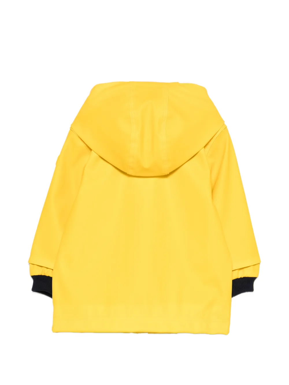 Желтая куртка с капюшоном, длинными рукавами, накладными карманами, застежкой на кнопки и полосатой подкладкой капюшона