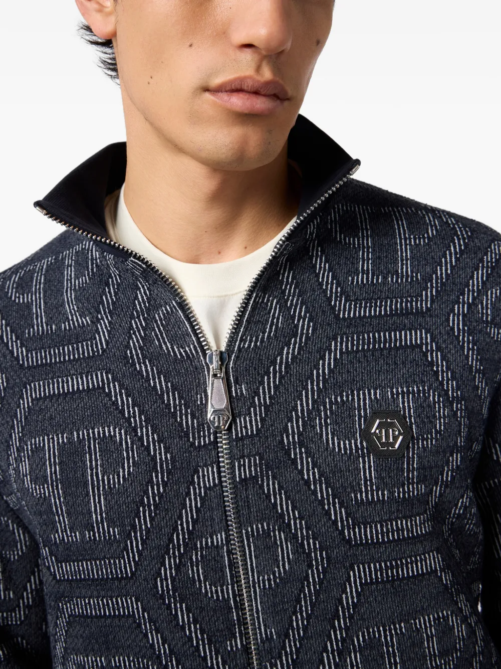 Темно-синий с монограммным узором, застежка на молнию, эмблема с логотипом, высокий воротник, ребристый край