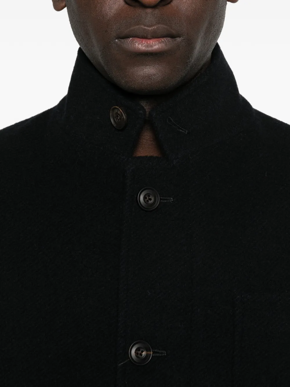 Темно-синяя, застежка на пуговицы спереди, накладные карманы, стойка-воротник, длинные рукава, манжеты на пуговицах