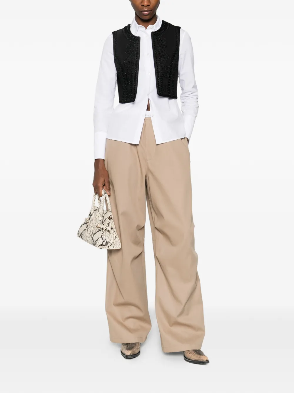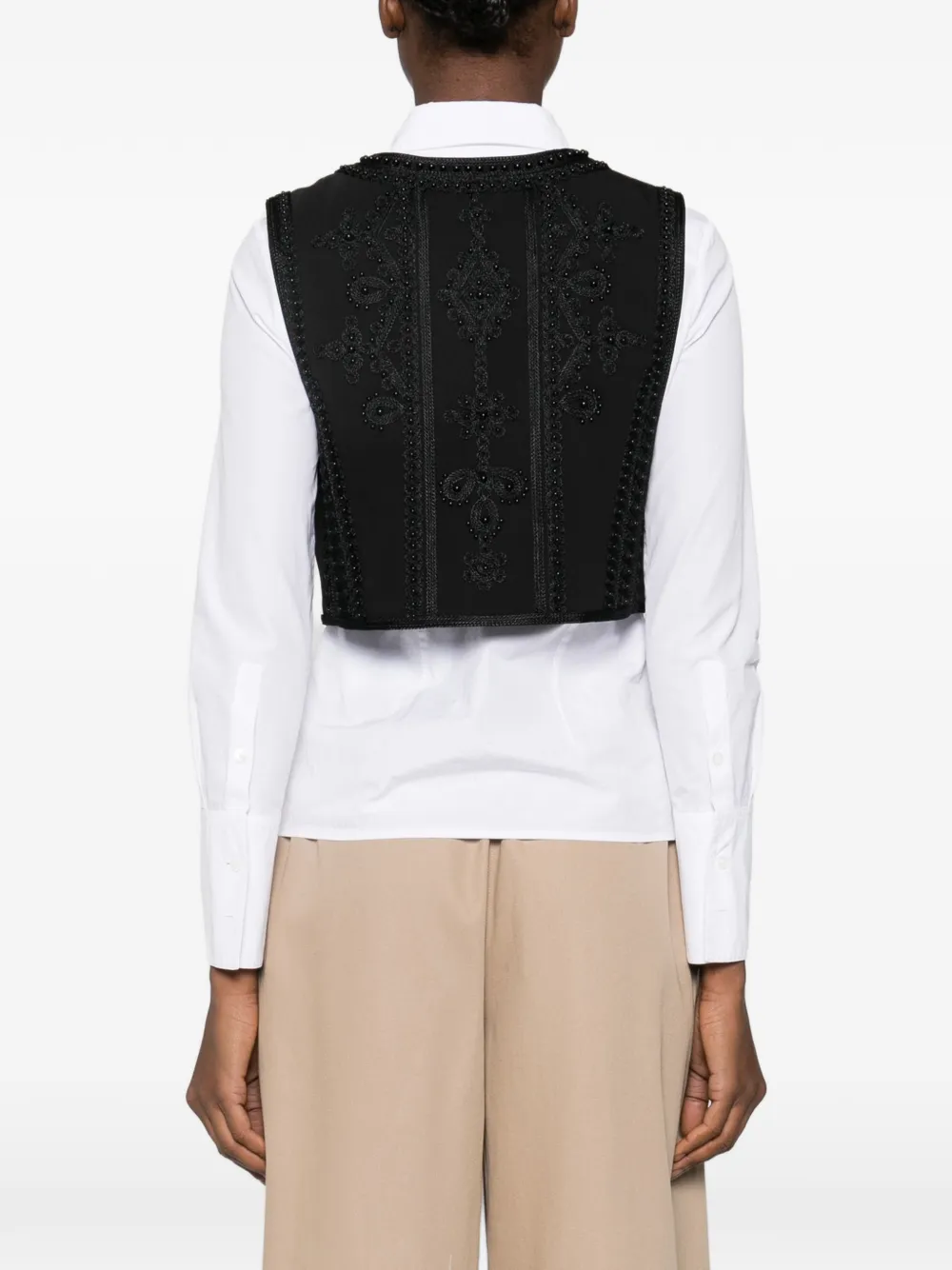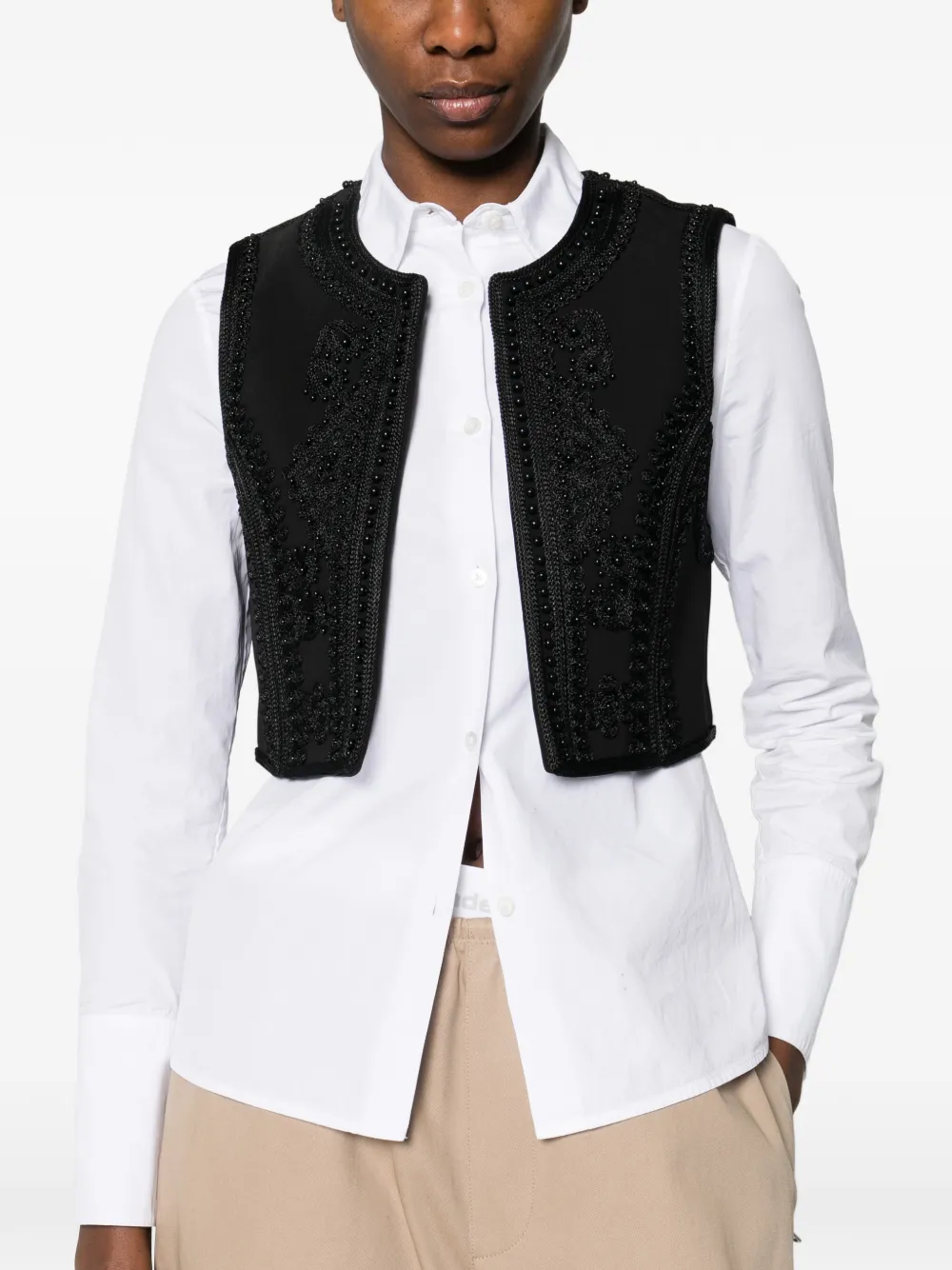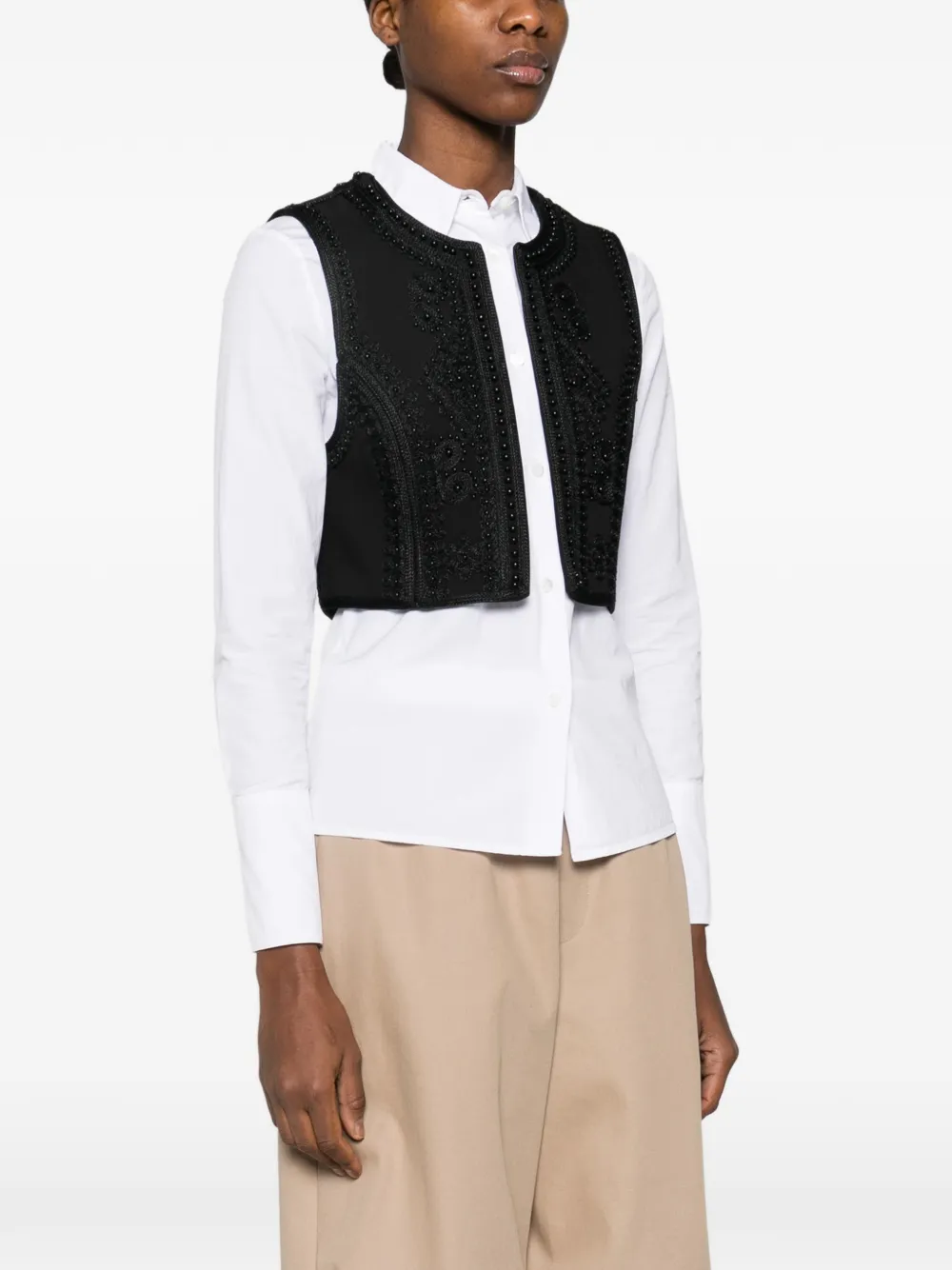 Черный укороченный жилет без рукавов с круглым вырезом и украшением из бусин, без застежки