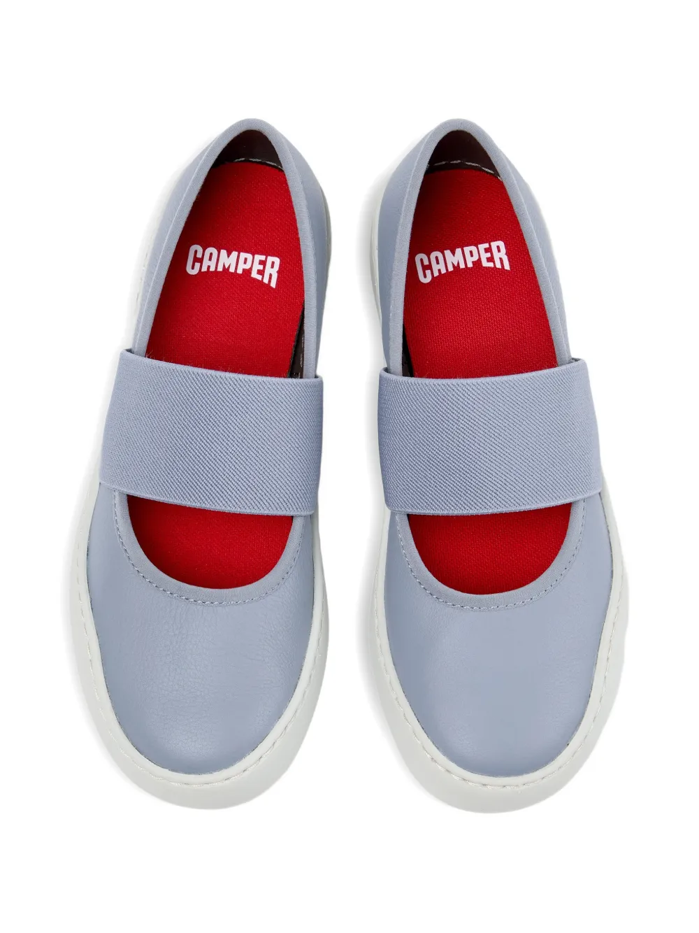 Светло-голубой цвет, гладкая отделка, эластичный ремешок, круглый нос, плоская подошва, однотонная строчка