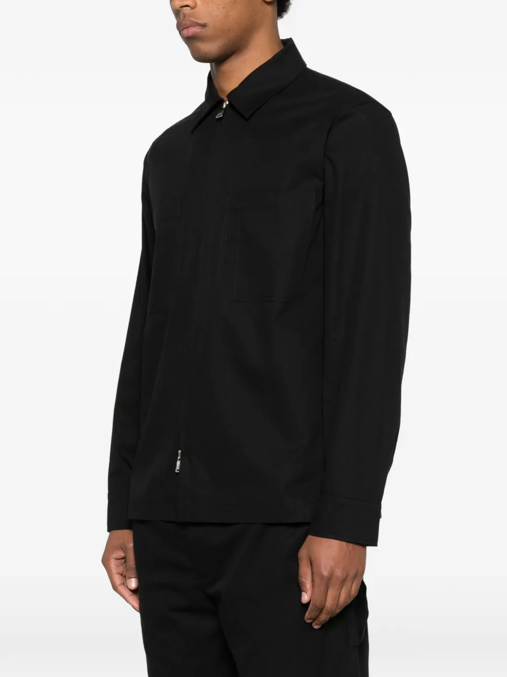 Черная куртка с застежкой-молнией спереди, классическим воротником, длинными рукавами, двумя накладными карманами на груди и прямым подолом