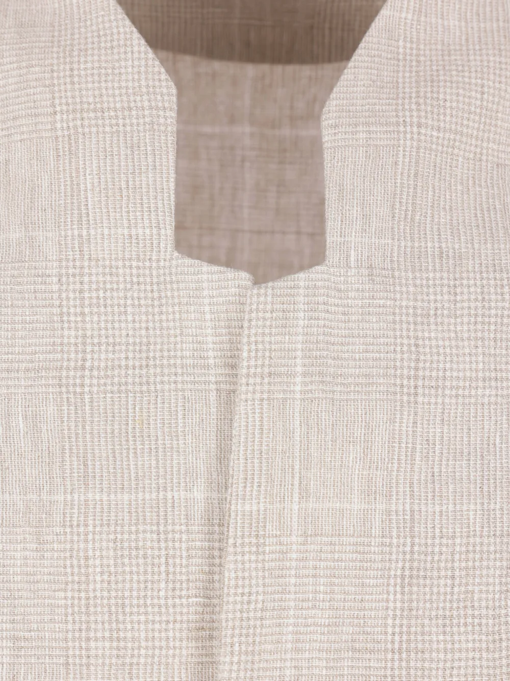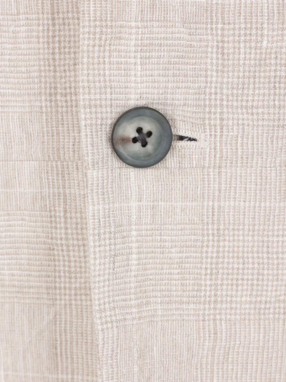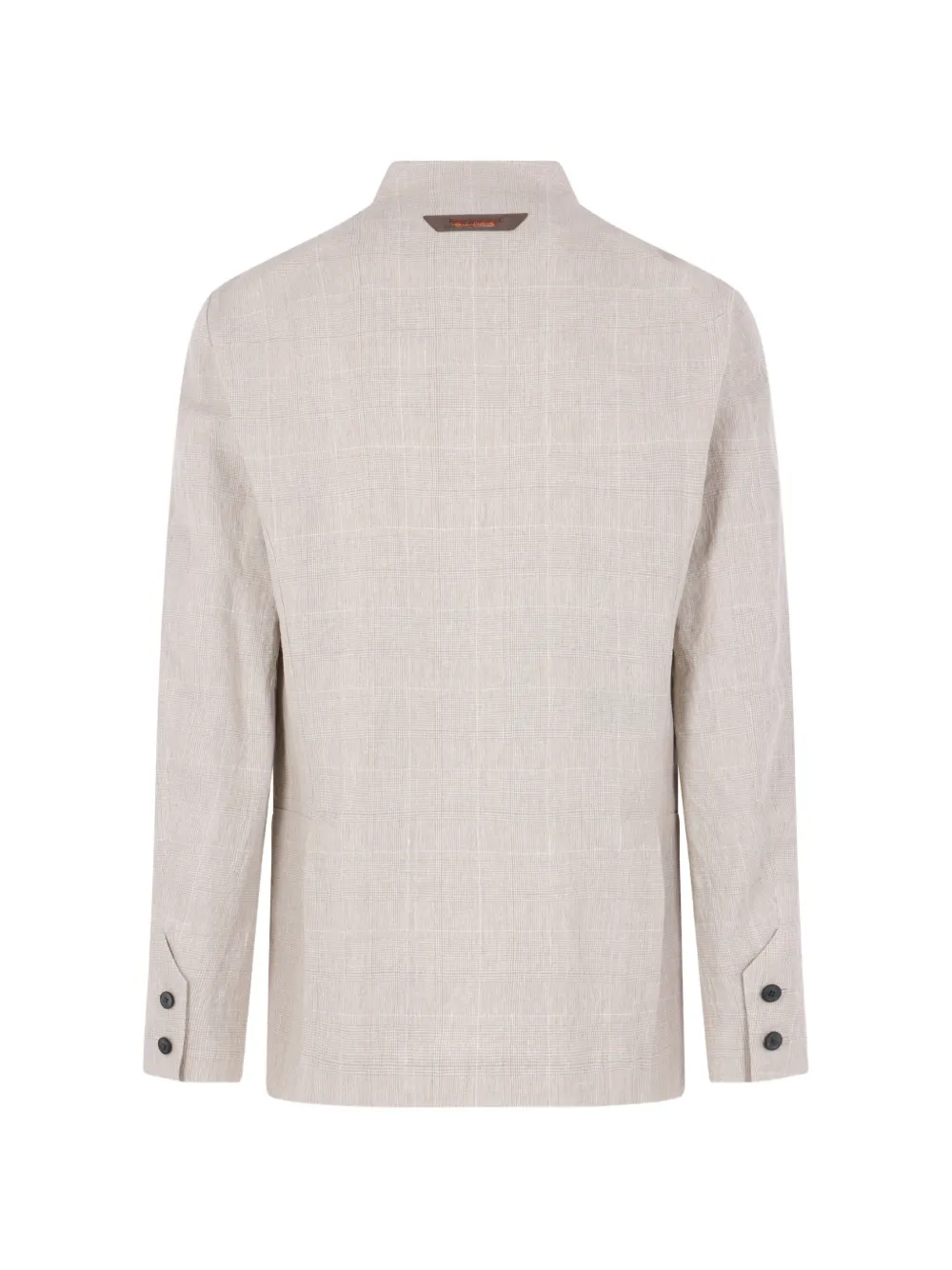 Бежевый жакет в клетку с застежкой на пуговицы, воротником-стойкой и прорезным карманом