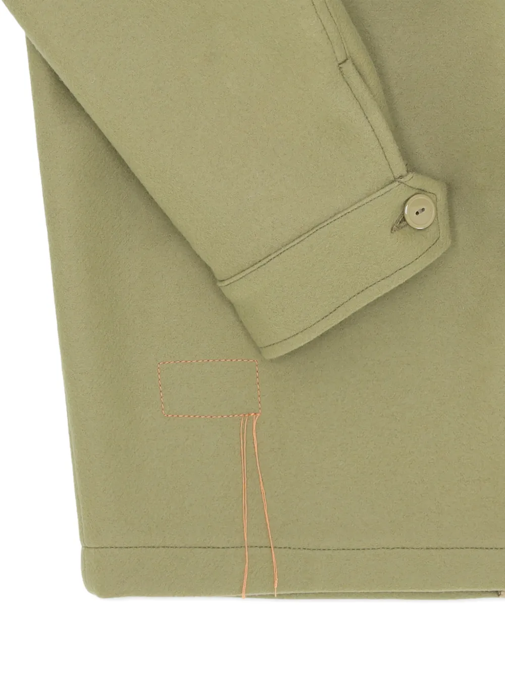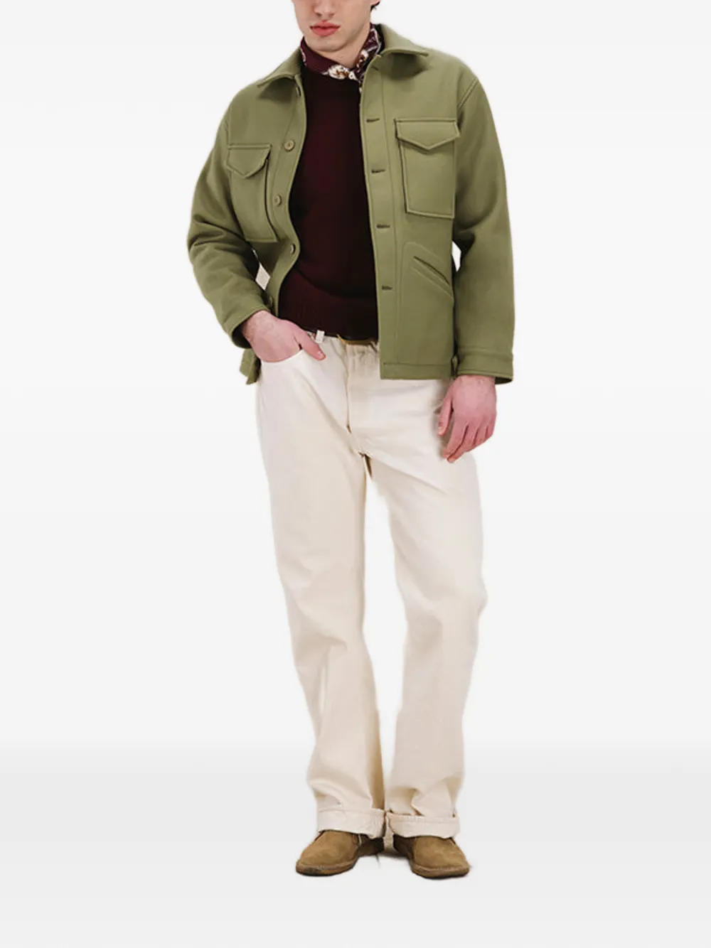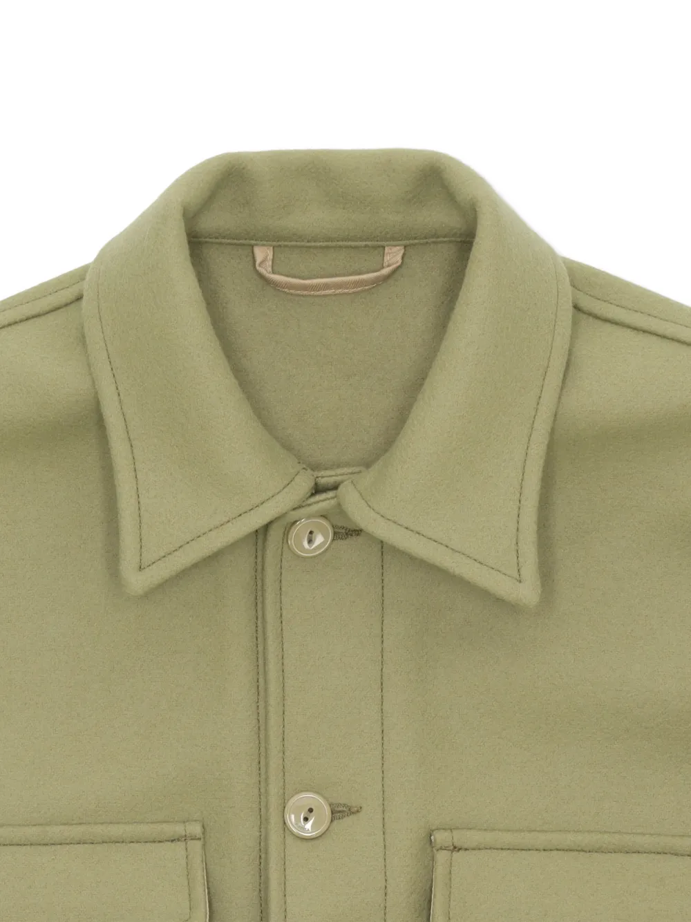 Шалфейно-зеленый цвет, накладные карманы с клапанами, прорезные карманы, застежка на пуговицы, классический воротник, длинные рукава