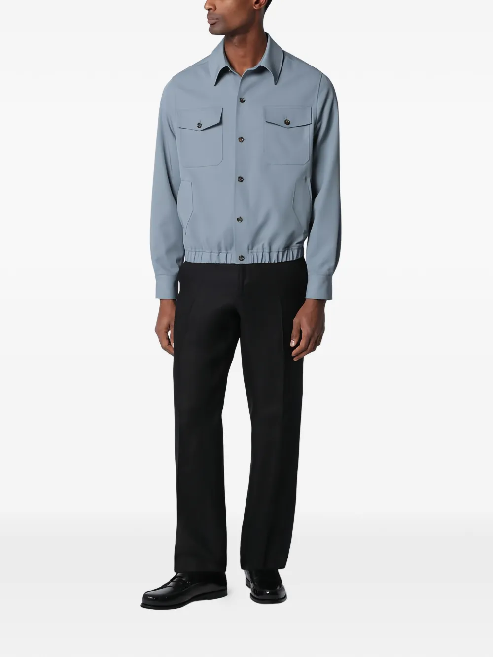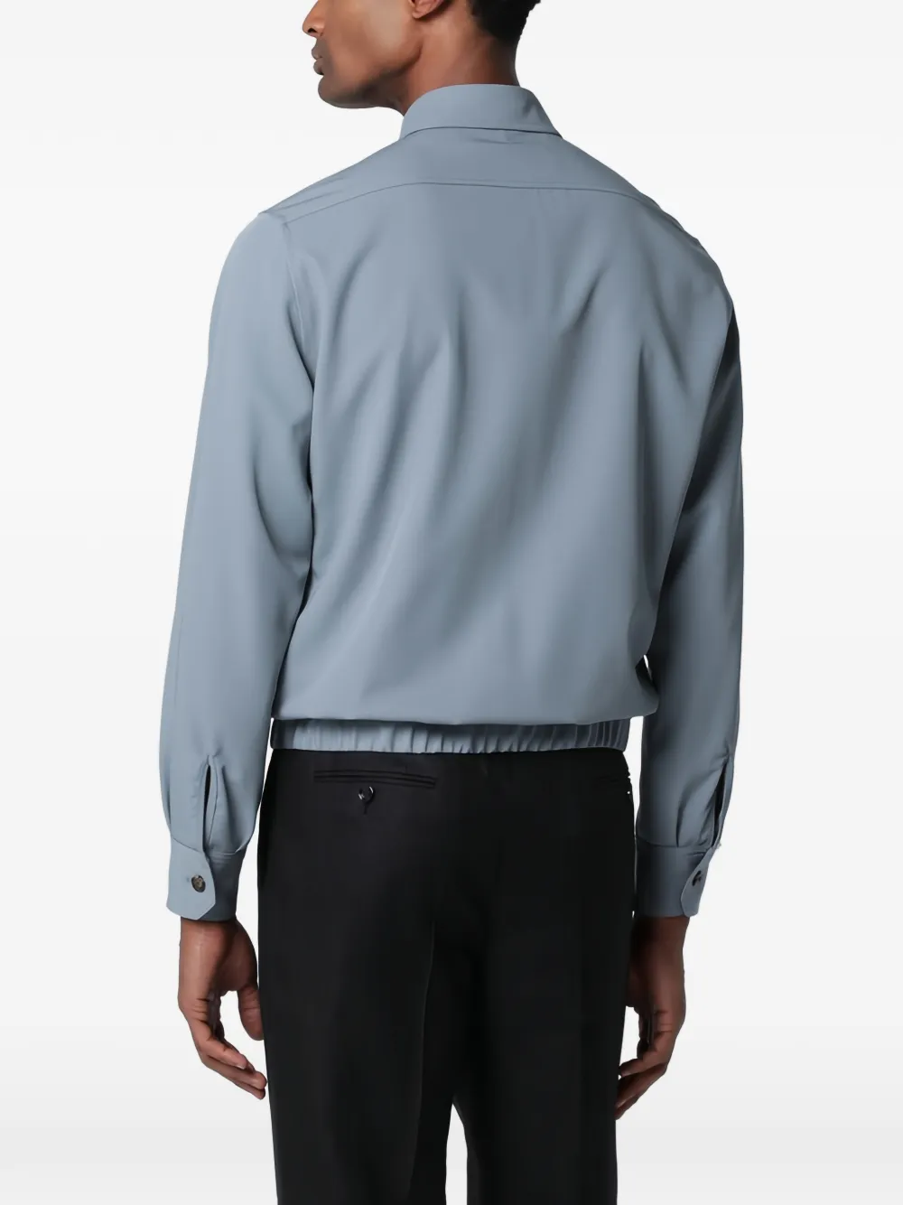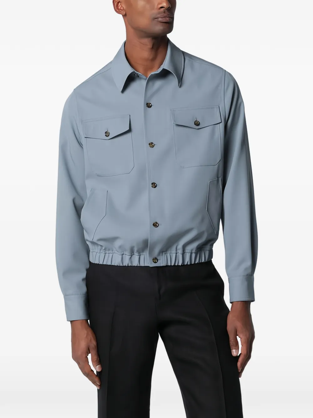 Серый цвет, застежка на пуговицы спереди, нагрудные клапанные карманы на пуговицах, длинные рукава, манжеты на пуговицах, эластичный низ