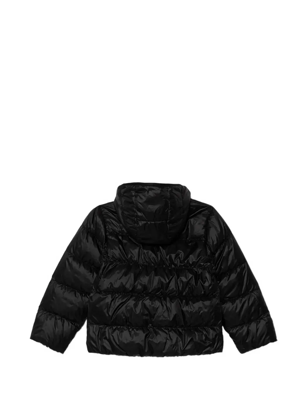 Черная пуховая куртка с капюшоном, декорированная логотипом, с длинными рукавами